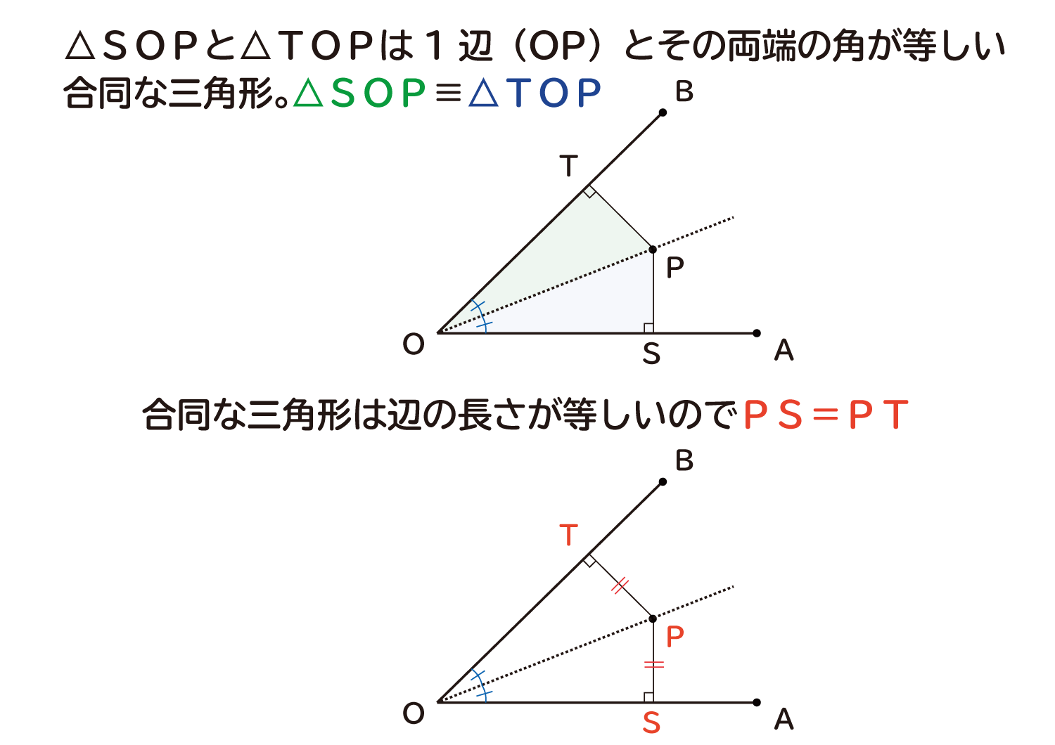 ※直線OPは∠AOBの二等分線なので、∠SOP=∠TOPとなっている。