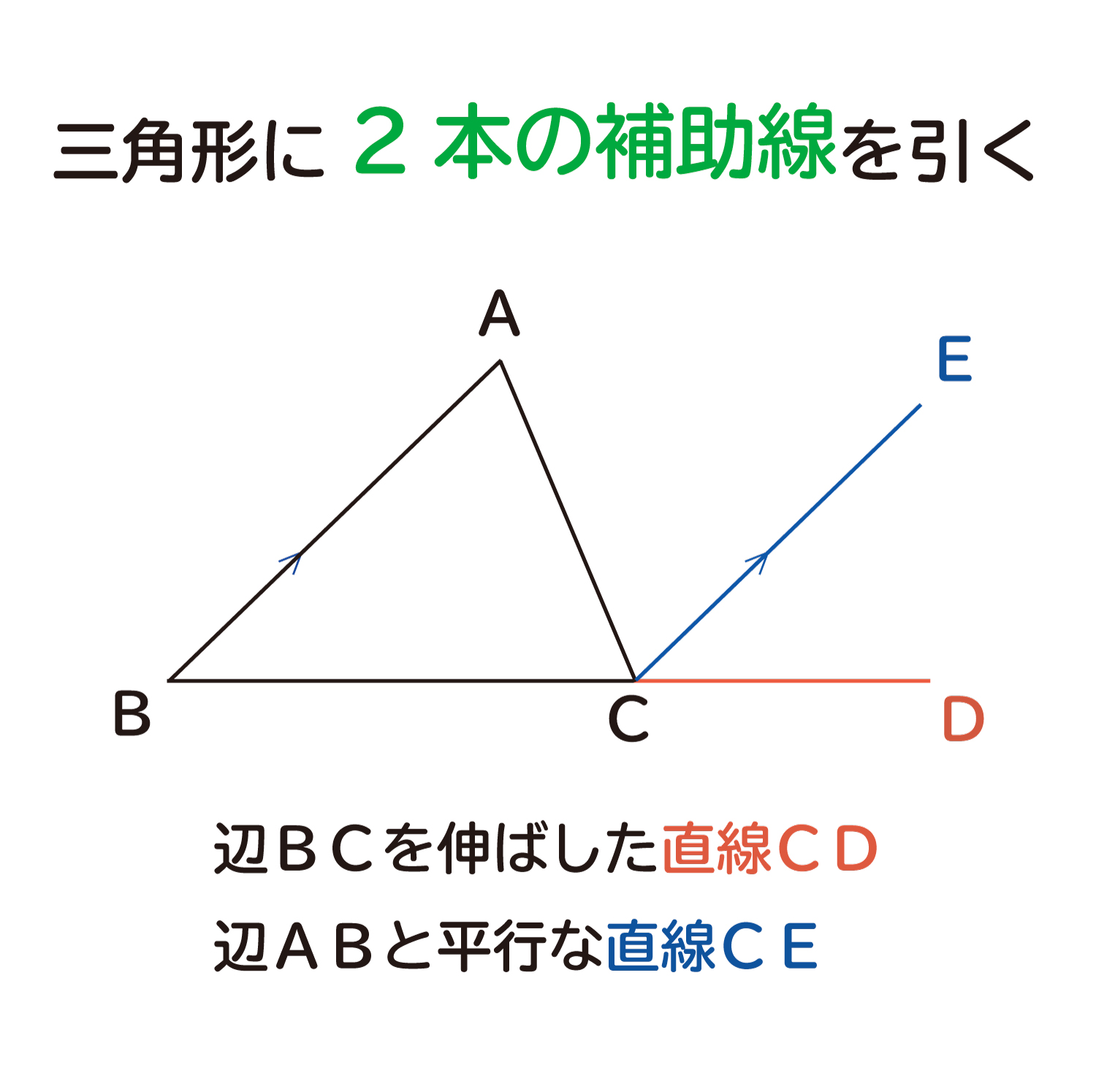 三角形の外角と内角の関係を確認するために、下のような三角形ABCを使います。ここで、2本の補助線を引きます。辺BCを伸ばした直線をCD、辺ABに平行な直線をCEとした補助線です。