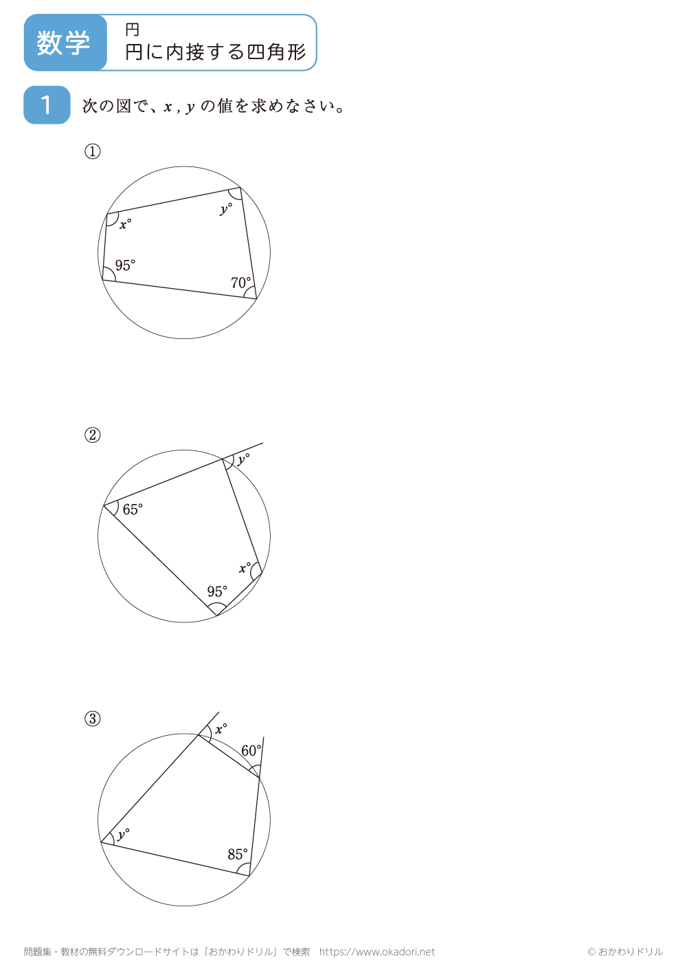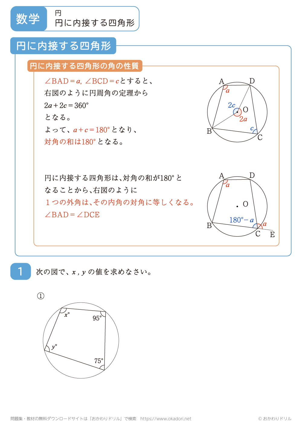 このページは、中学3年生で習う「円に内接する四角形」が学習できるページです。