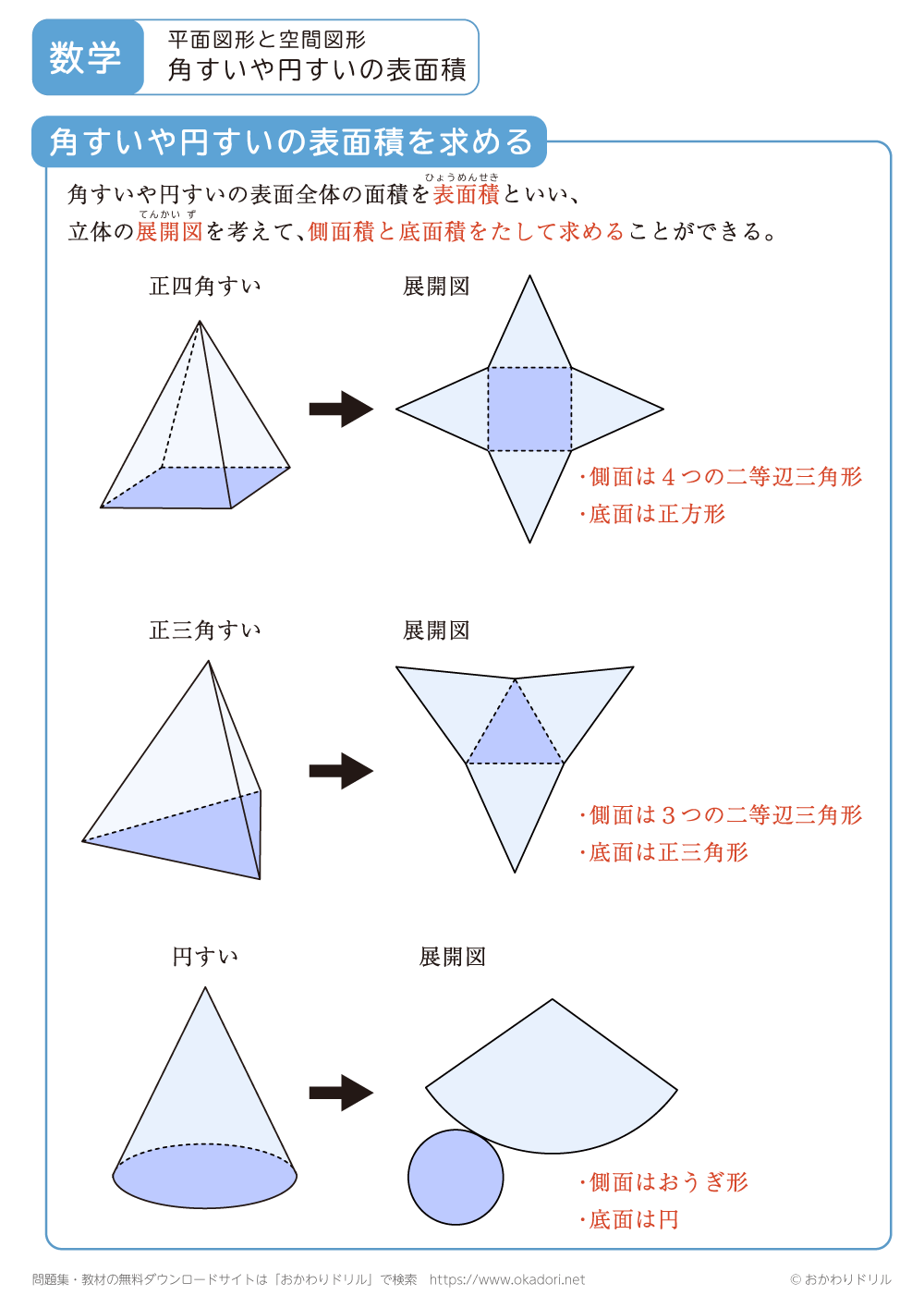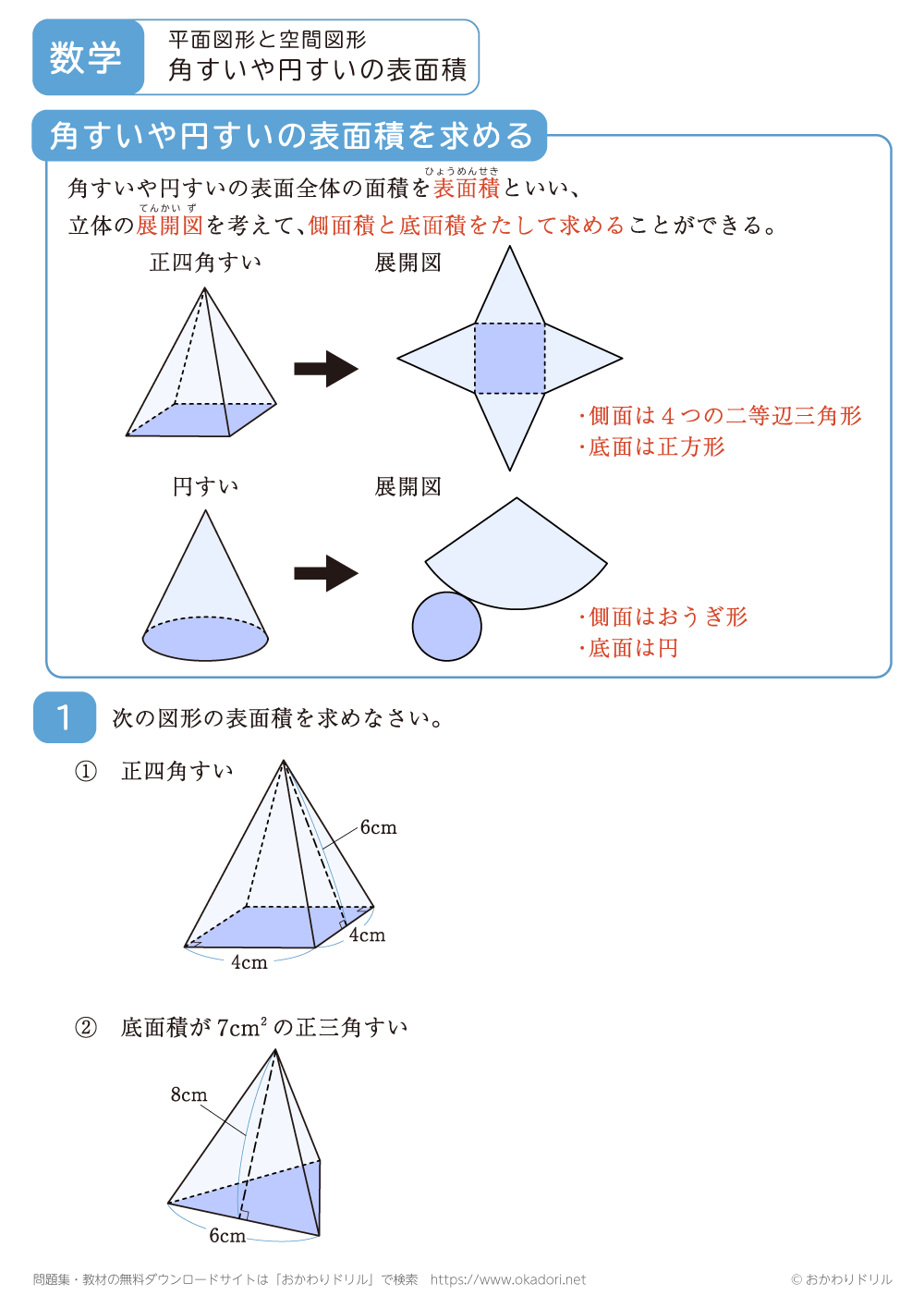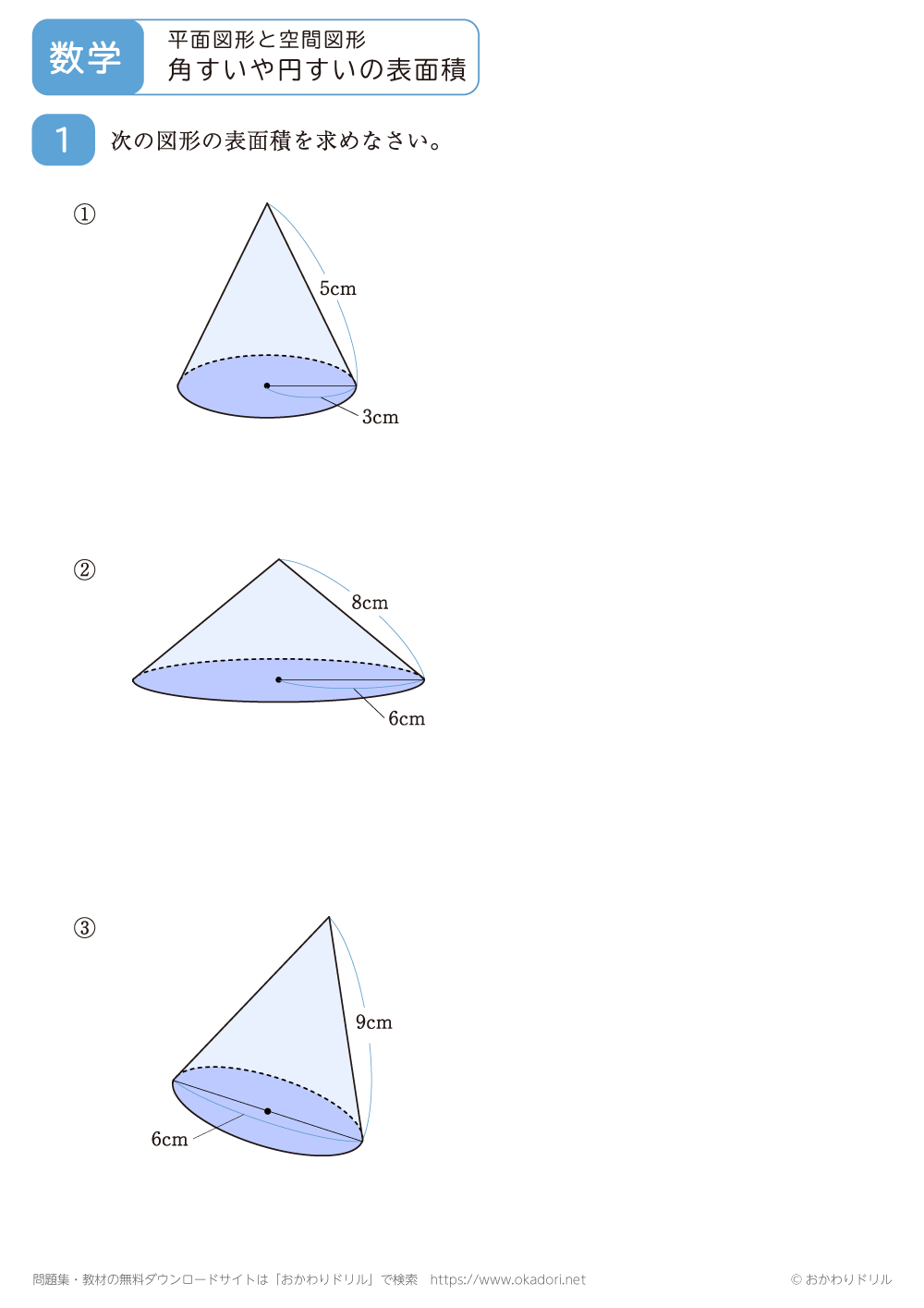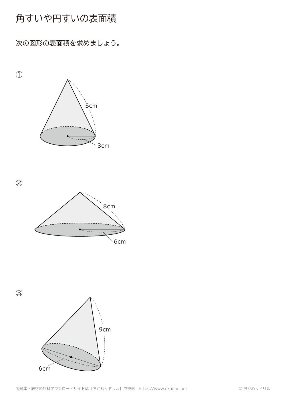 角すいや円すいの表面積を求める問題です。角すいや円すいの表面積は、側面積と底面積をたして求めます。円すいの側面はおうぎ形になるので、おうぎ形の面積の公式を使って計算します。