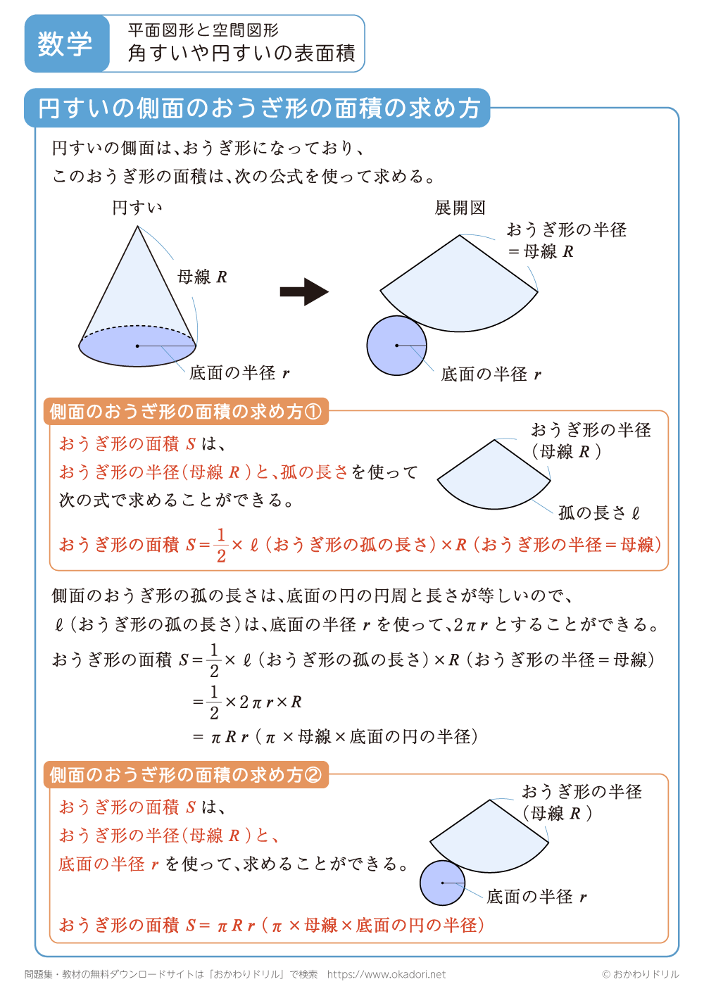・円すいの側面のおうぎ形の面積Sは、母線をR、底面の円の半径をrとすると、次の式で表すことができます。