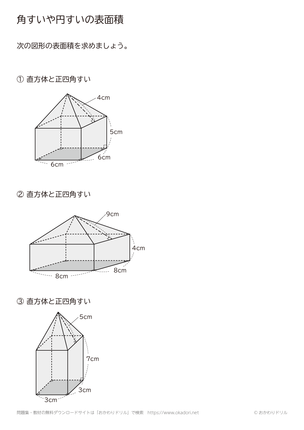 ・表面積は、立体の展開図を考えて、側面積と底面積をたして求めることができます。