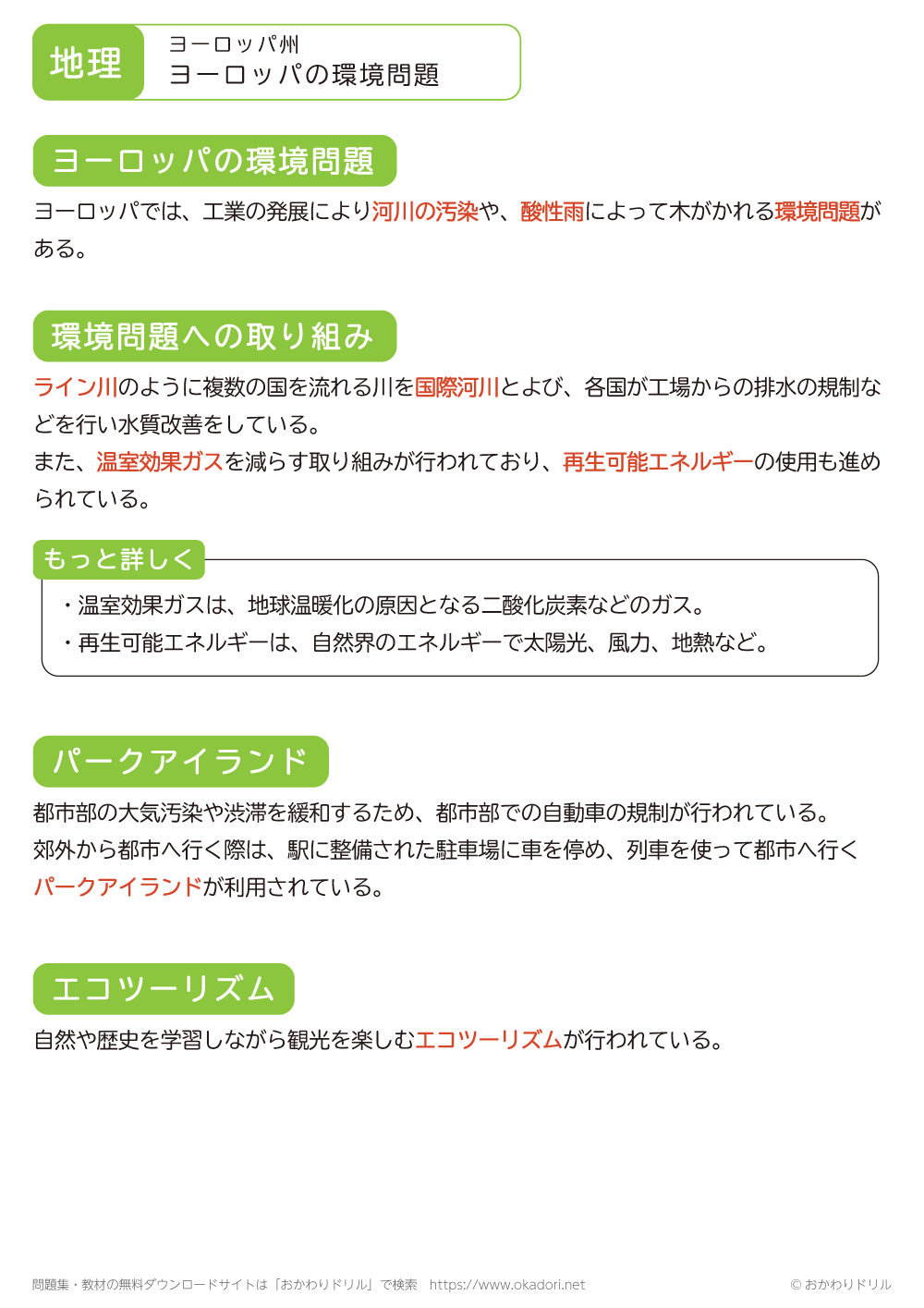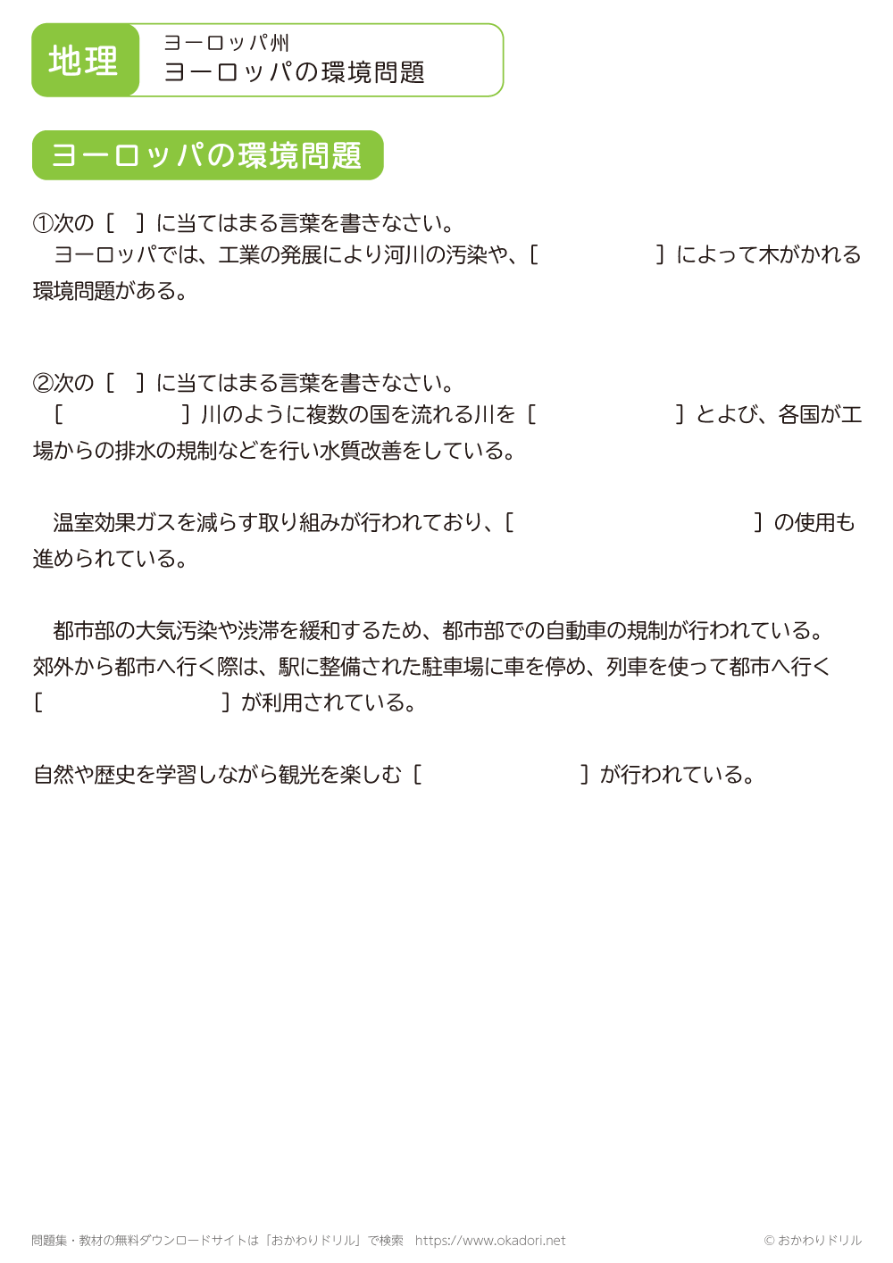 ヨーロッパでは、工業の発展にともなって環境問題が起きたため、さまざまな取り組みを行っています。ヨーロッパの環境問題や取り組みについて学習するためのプリントを用意しています。覚えることができたかテストしたい時には、問題プリントを利用してみて下さい。