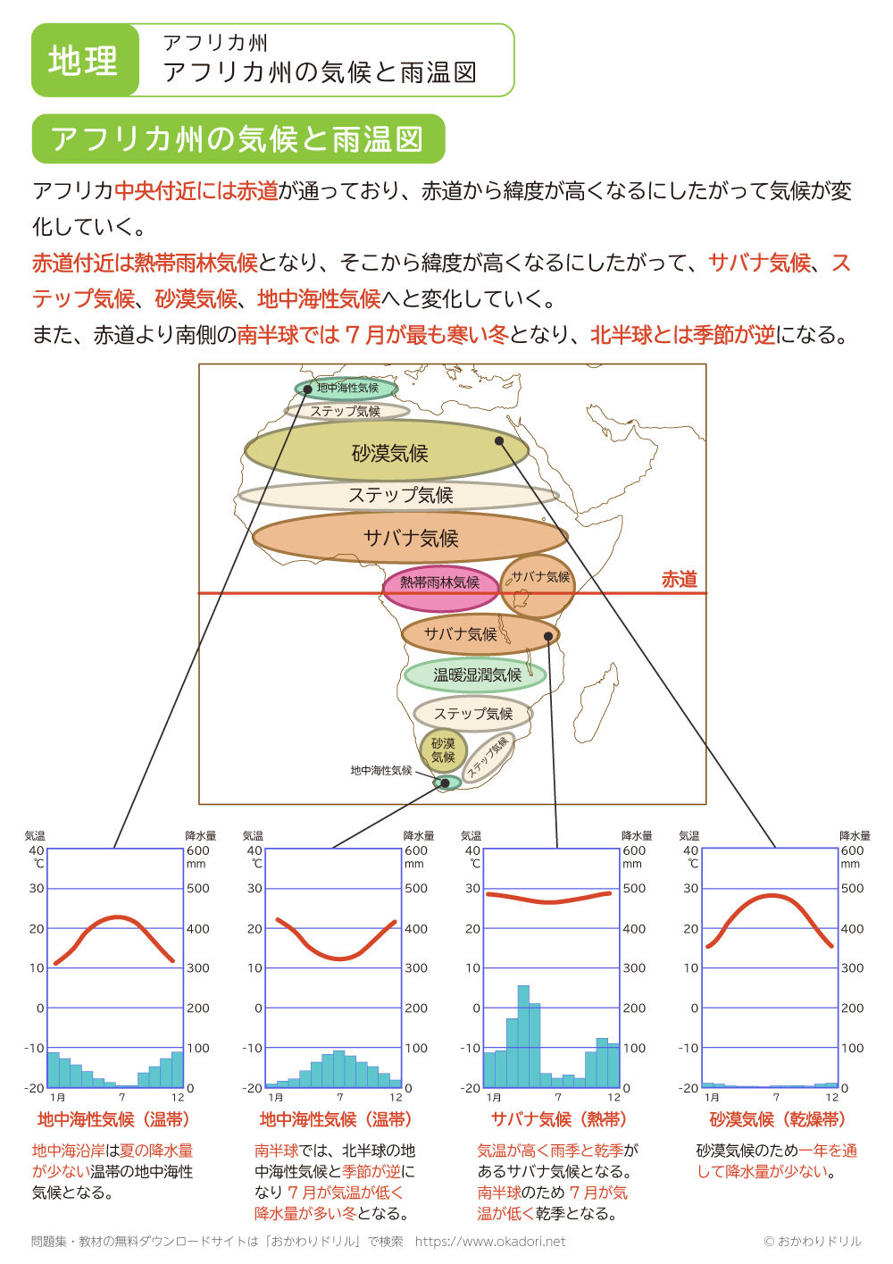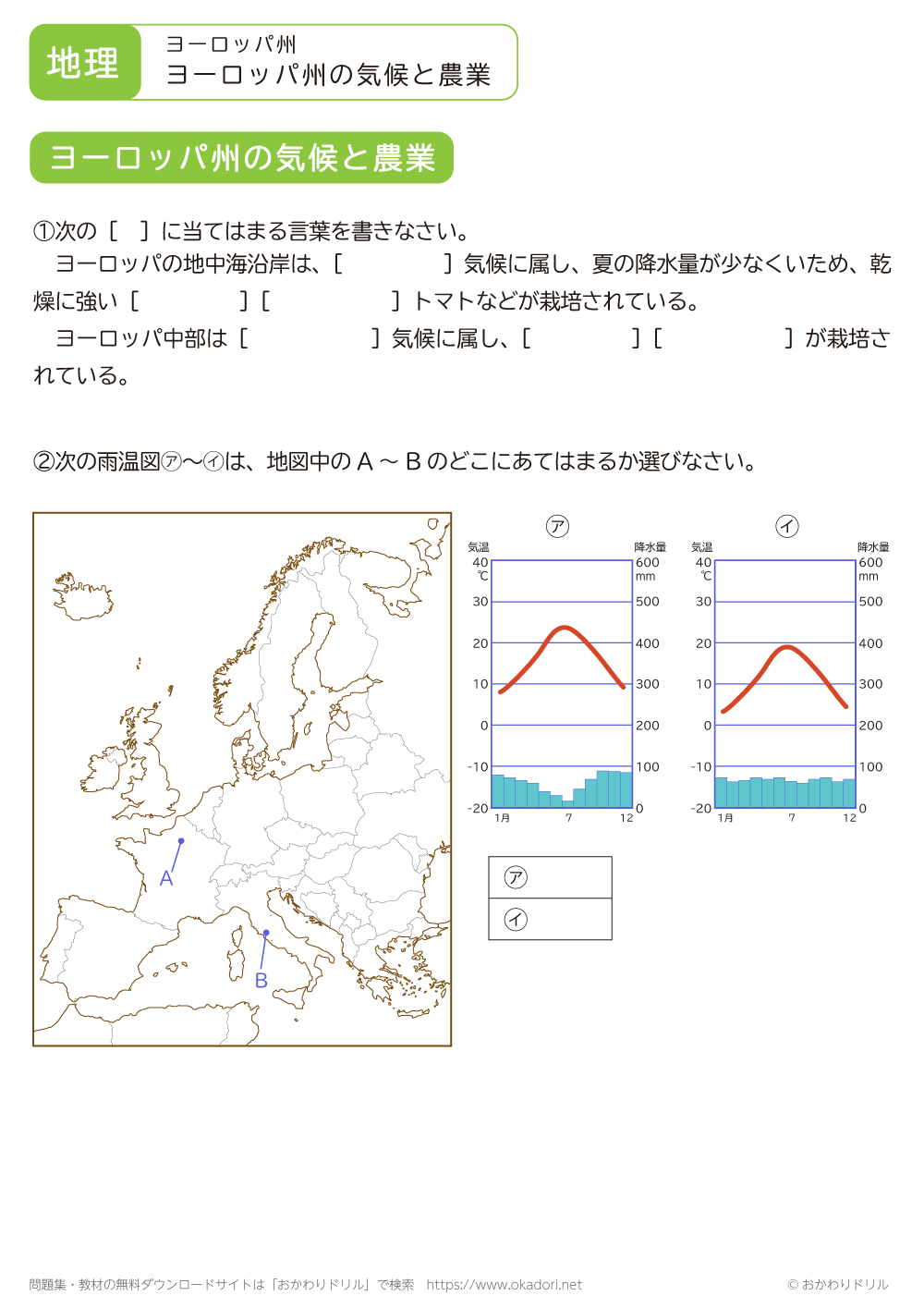 ヨーロッパのそれぞれの地域で、どういった気候や農業、雨温図になるか学習するためのプリントを用意しています。覚えることができたかテストしたい時には、問題プリントを利用してみて下さい。