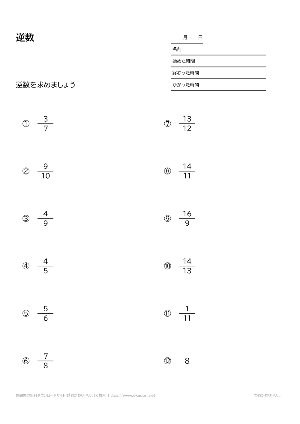 このページは、小学6年生で習う「逆数」が学習できるページです。