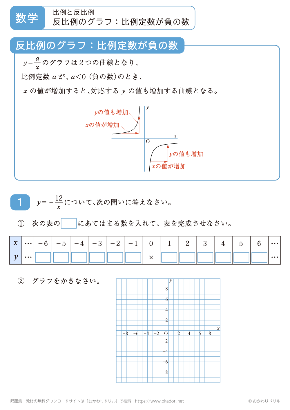 このページは、中学1年生で習う「反比例のグラフ:比例定数が負の数」が学習できるページです。