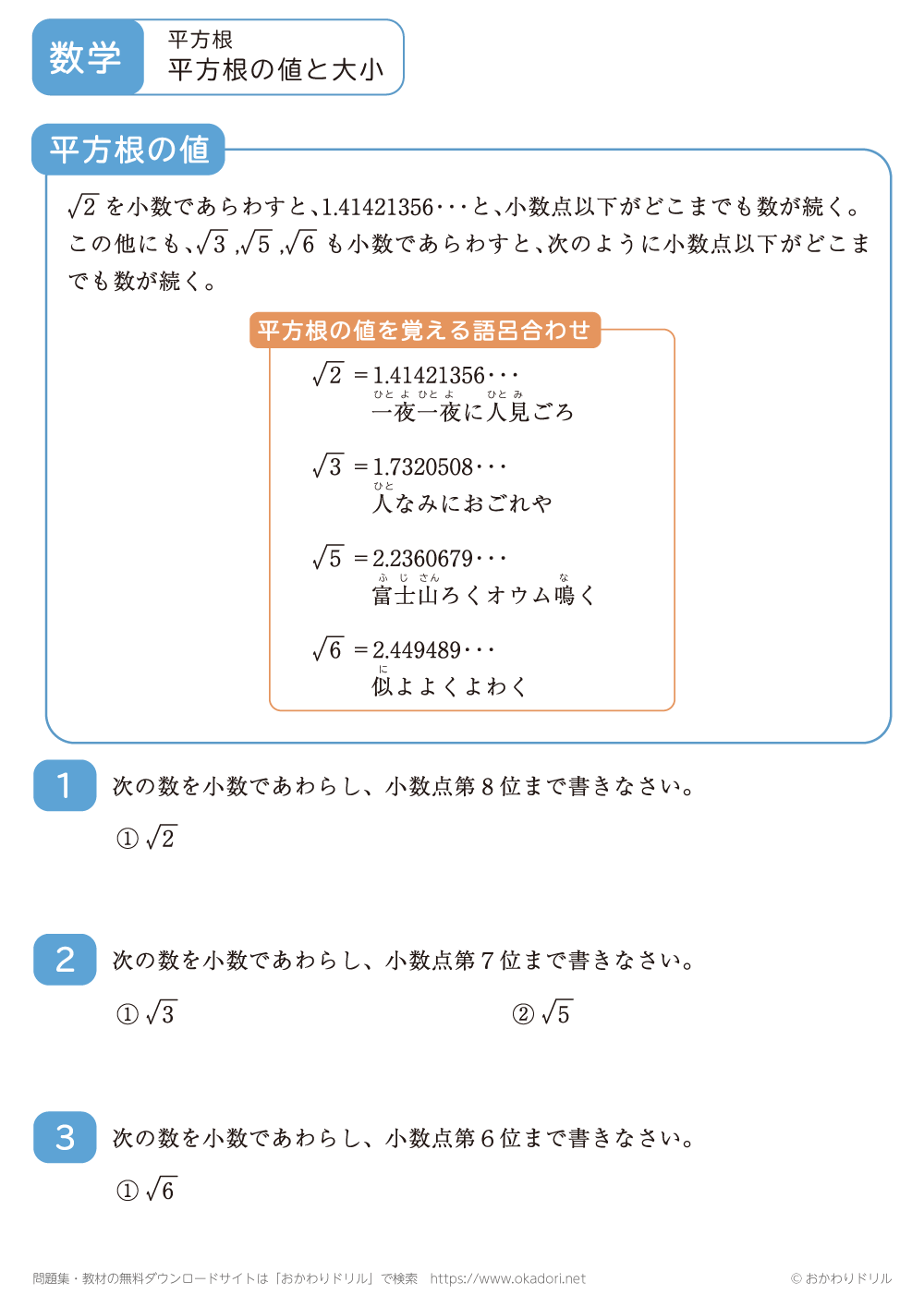 平方根の値や大小の問題です。いくつかの平方根を小数であらわしたときに語呂合わせで覚えたり、平方根の値の大小を比べる問題を解いてみましょう。