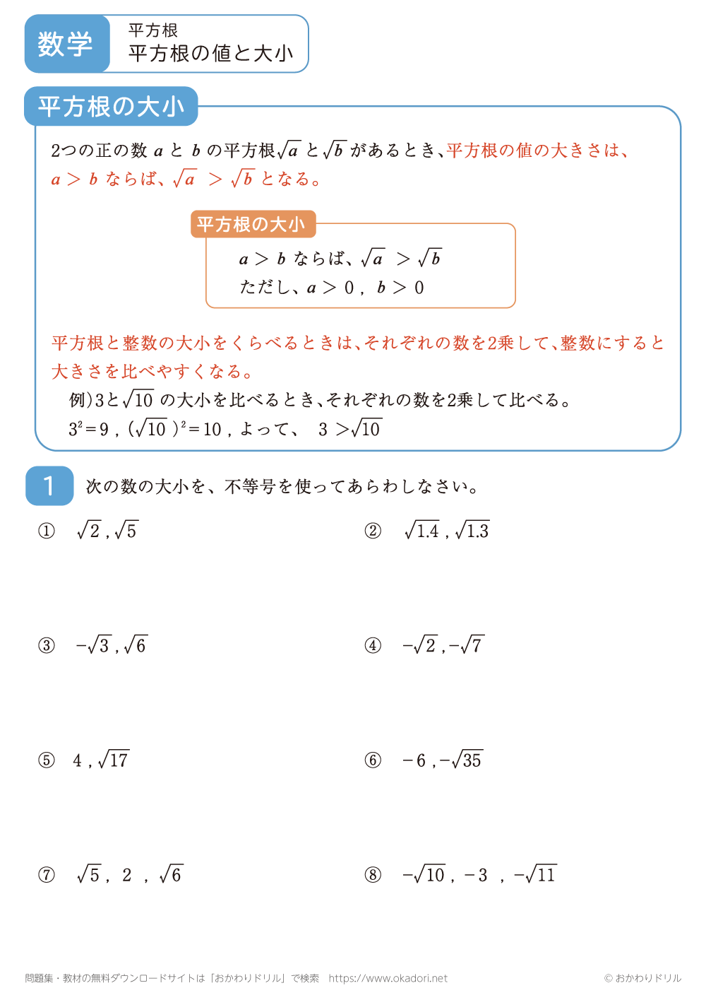 ・2つの正の数aとbの平方根√aと√bがあるとき、平方根の値の大きさはa>bならば、√a>√bとなる。