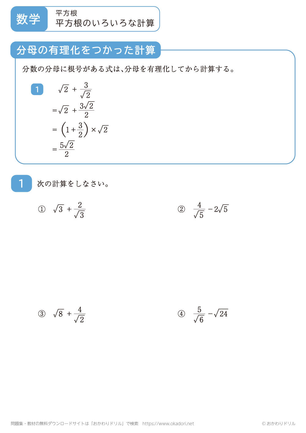 このページは、中学3年生で習う「平方根のいろいろな計算」が学習できるページです。