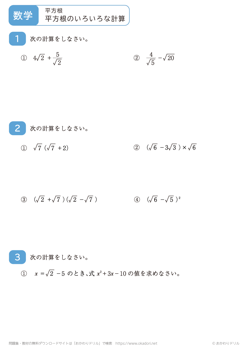平方根のいろいろな計算の問題です。平方根のある式で、分数の分母に根号がある計算や、分配法則・展開の公式を使った計算、式の値を求める問題を解いてみましょう。