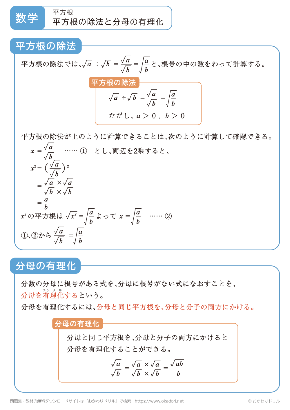 「平方根の除法と分母の有理化」の学習プリントはこちら