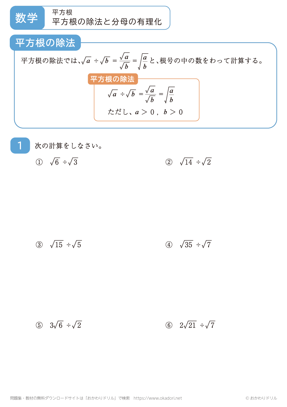 平方根の除法と分母の有理化の問題です。平方根の除法では根号の中の数をわって計算します。分数の分母を有理化するときは、分母と同じ平方根を分母と分子の両方にかけて問題を解いてみましょう。