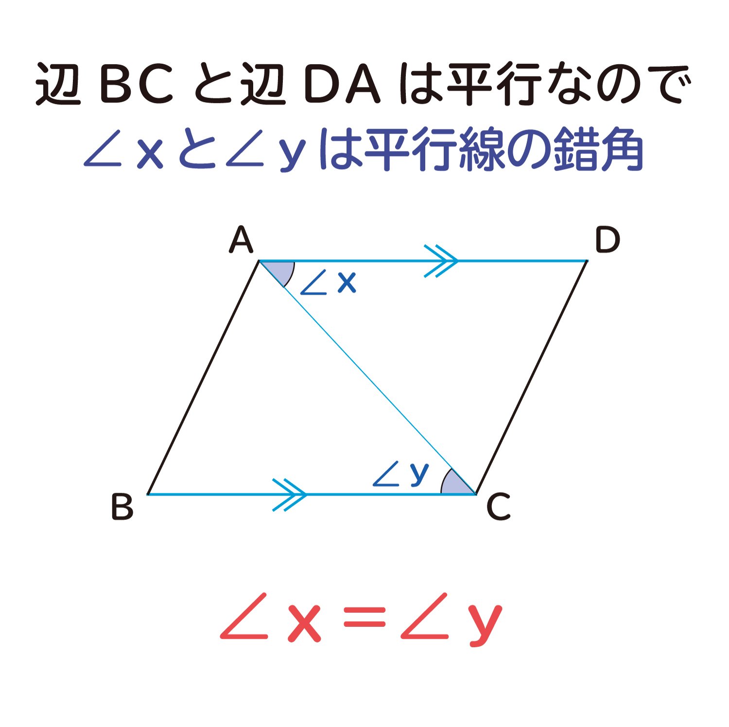 次に、辺BCと辺DAも平行になっており、∠xと∠yは平行線の錯角になっています。そのため、∠x=∠yとなります。