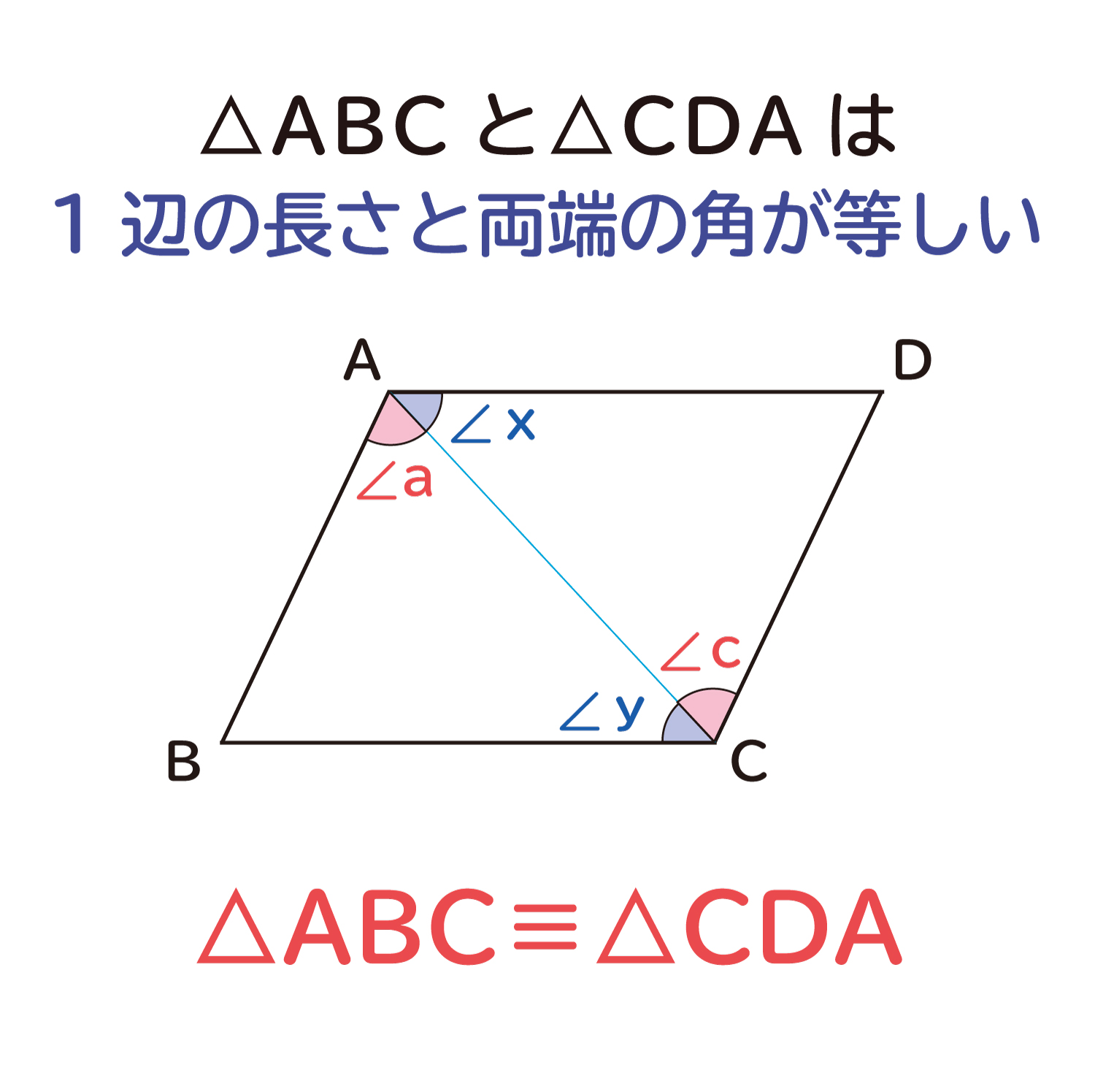 合同な三角形は、それぞれ辺の長さが等しくなるので、辺AB=辺CD、辺BC=辺DAということが言え、平行四辺形の対辺は等しくなることが確認できました!