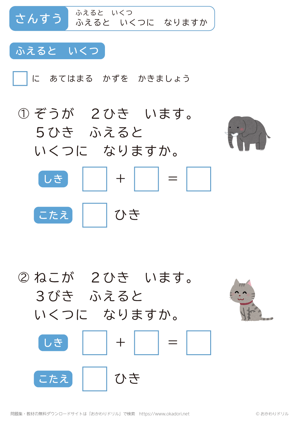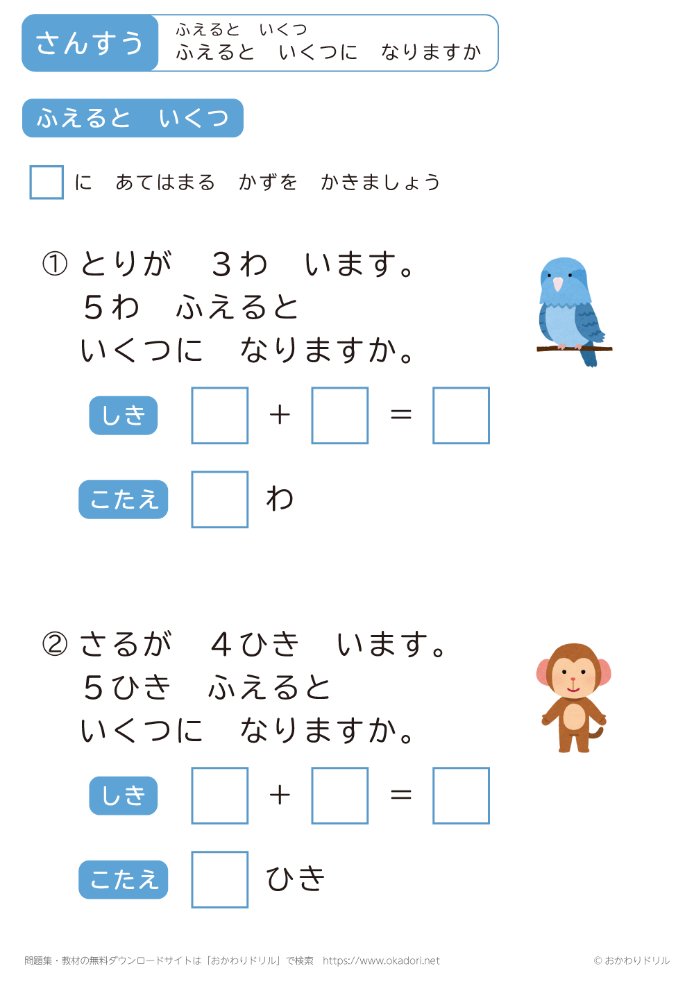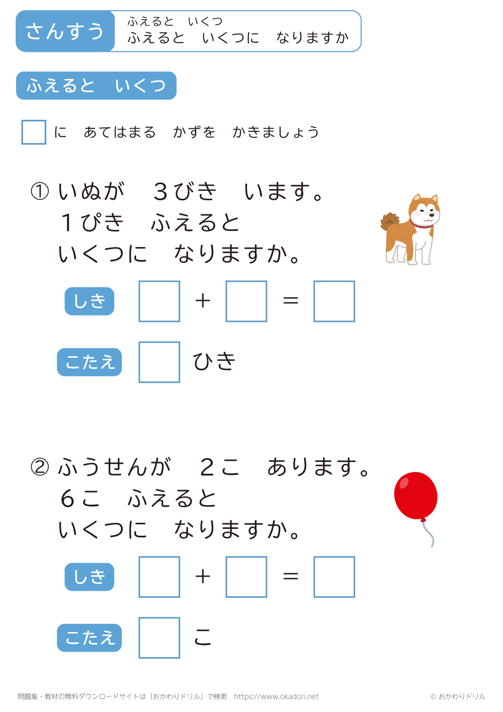 このページは、小学1年生で習う「ふえるといくつ」を学習できるページです。