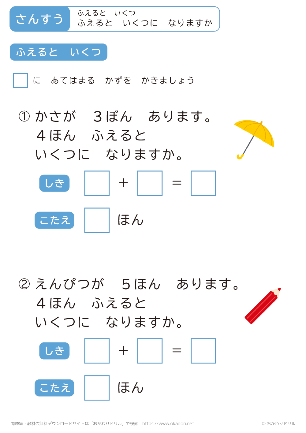 「ふえるといくつ」の学習プリントはこちら