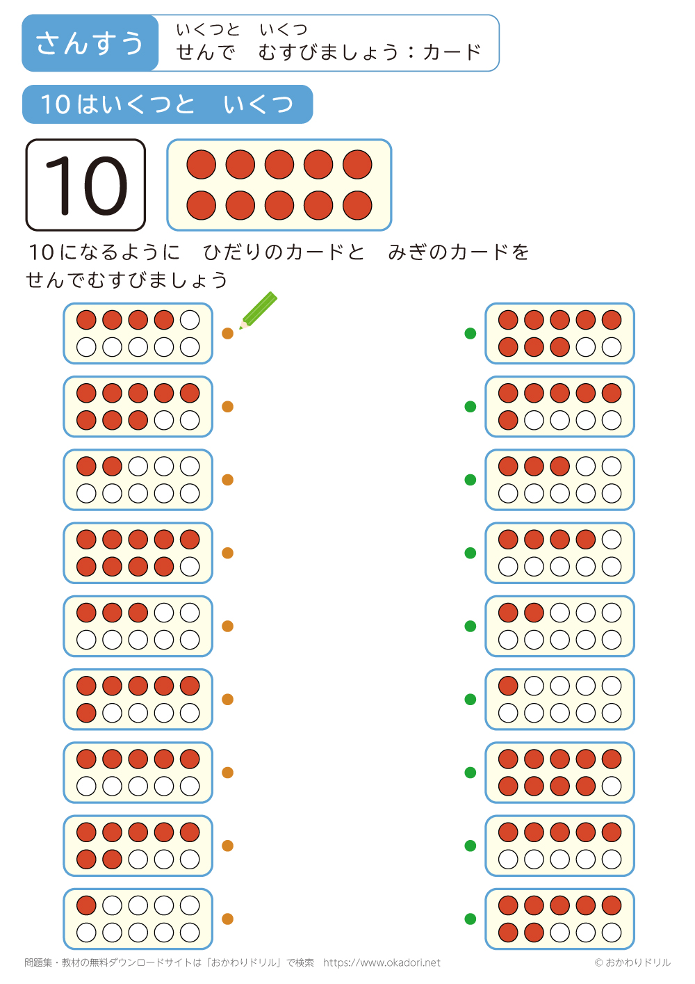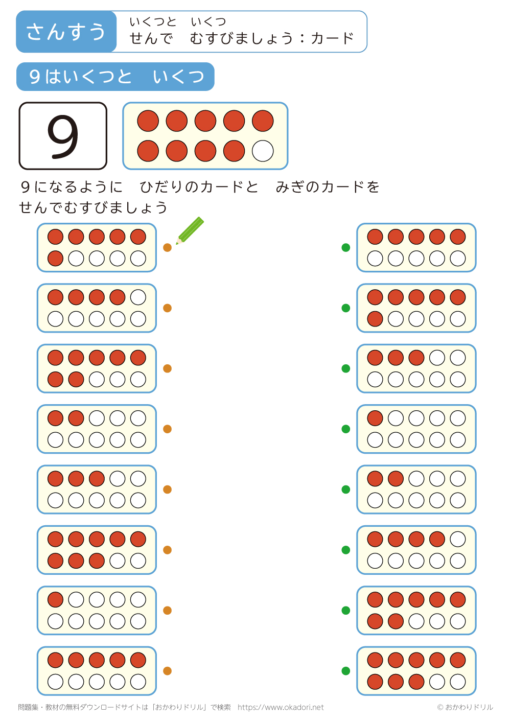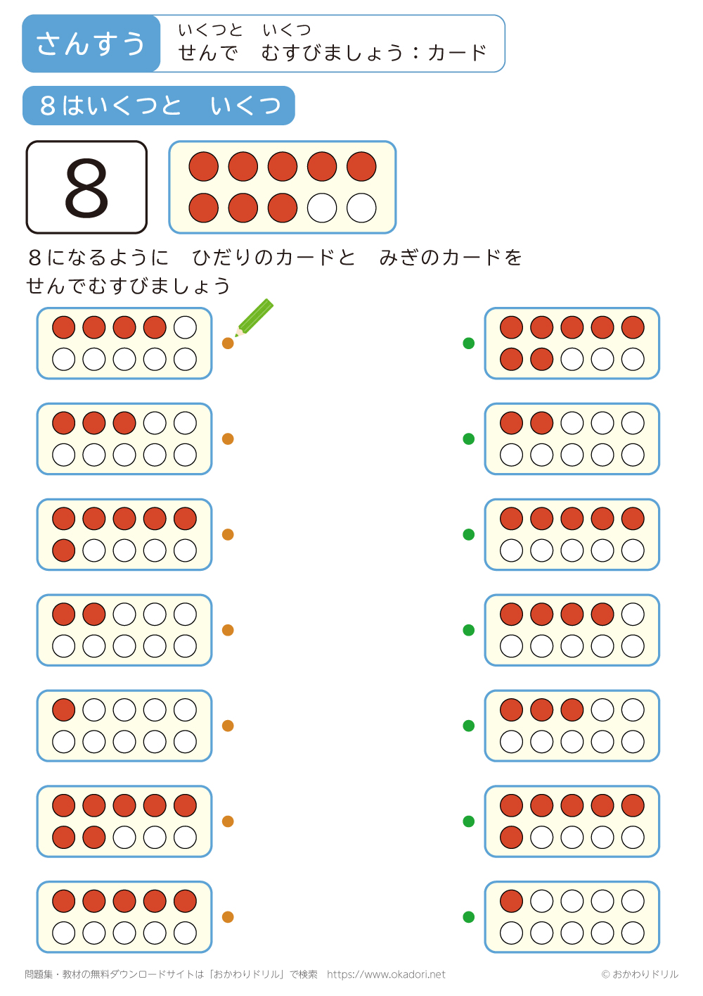・数が書かれた2つのカードを線でむすんで、合計が目的の数になるようにします。