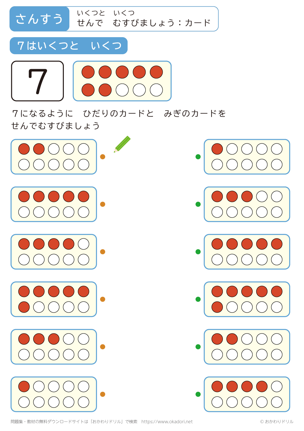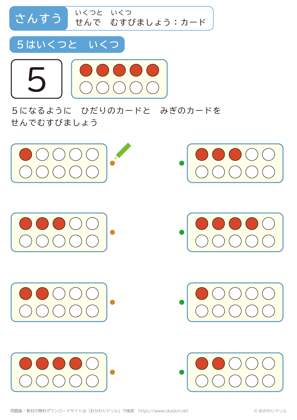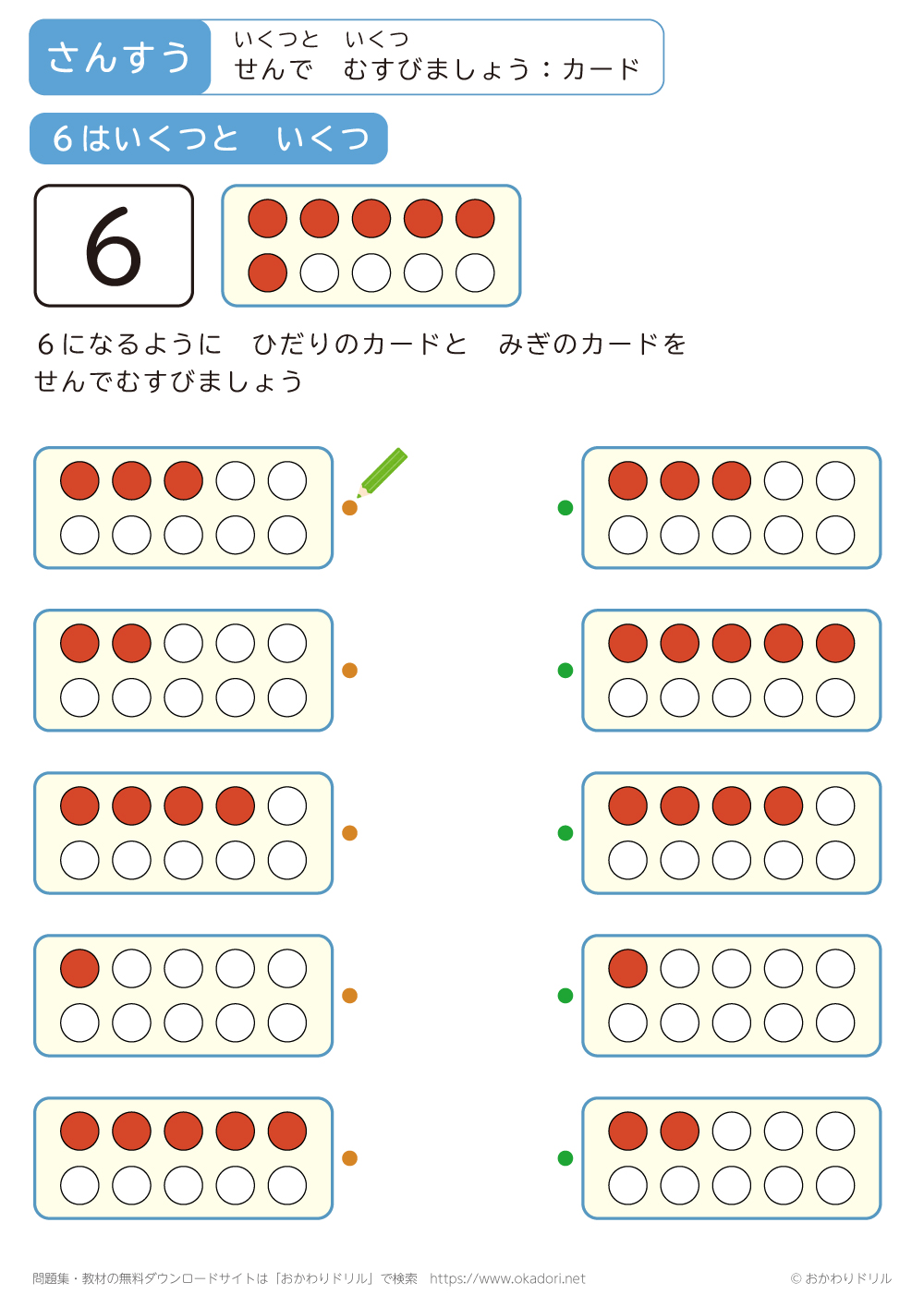 ・数が書かれた2つのカードを線でむすんで、合計が目的の数になるようにします。