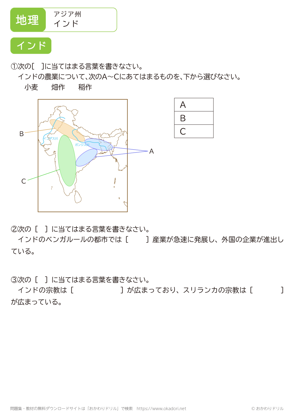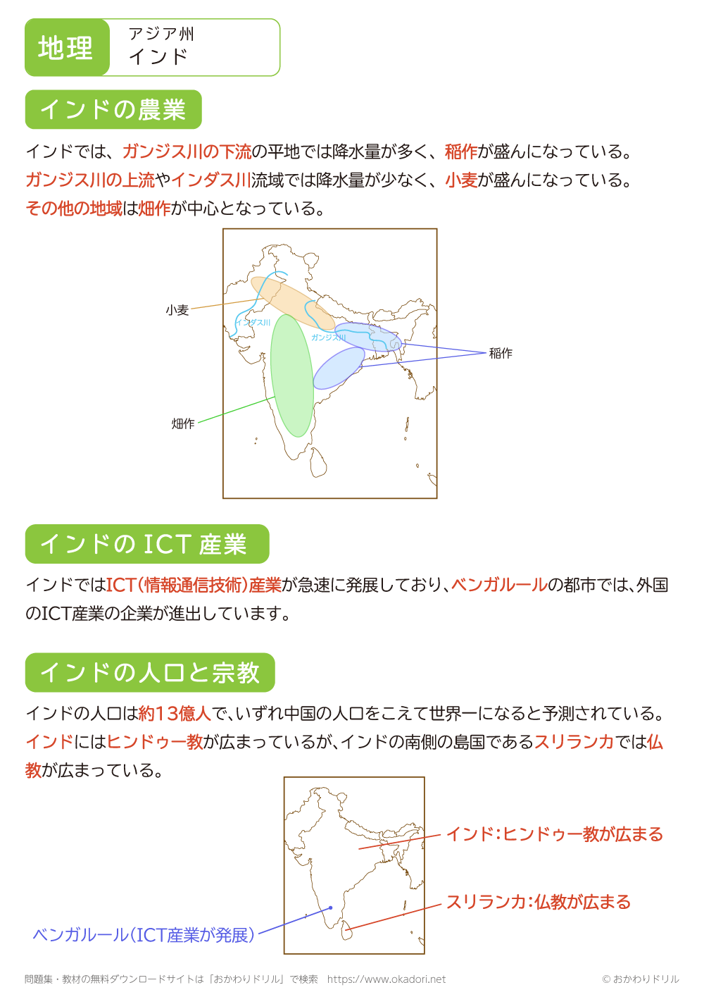 インドの農業は稲作と小麦が盛んになっています。それぞれ作られている地域を確認しましょう。また、ICT産業が発展しており外国の企業も進出しています。インドの農業、ICT産業、人口と宗教について学習するためのプリントを用意しています。覚えることができたかテストしたい時には、問題プリントを利用してみて下さい。