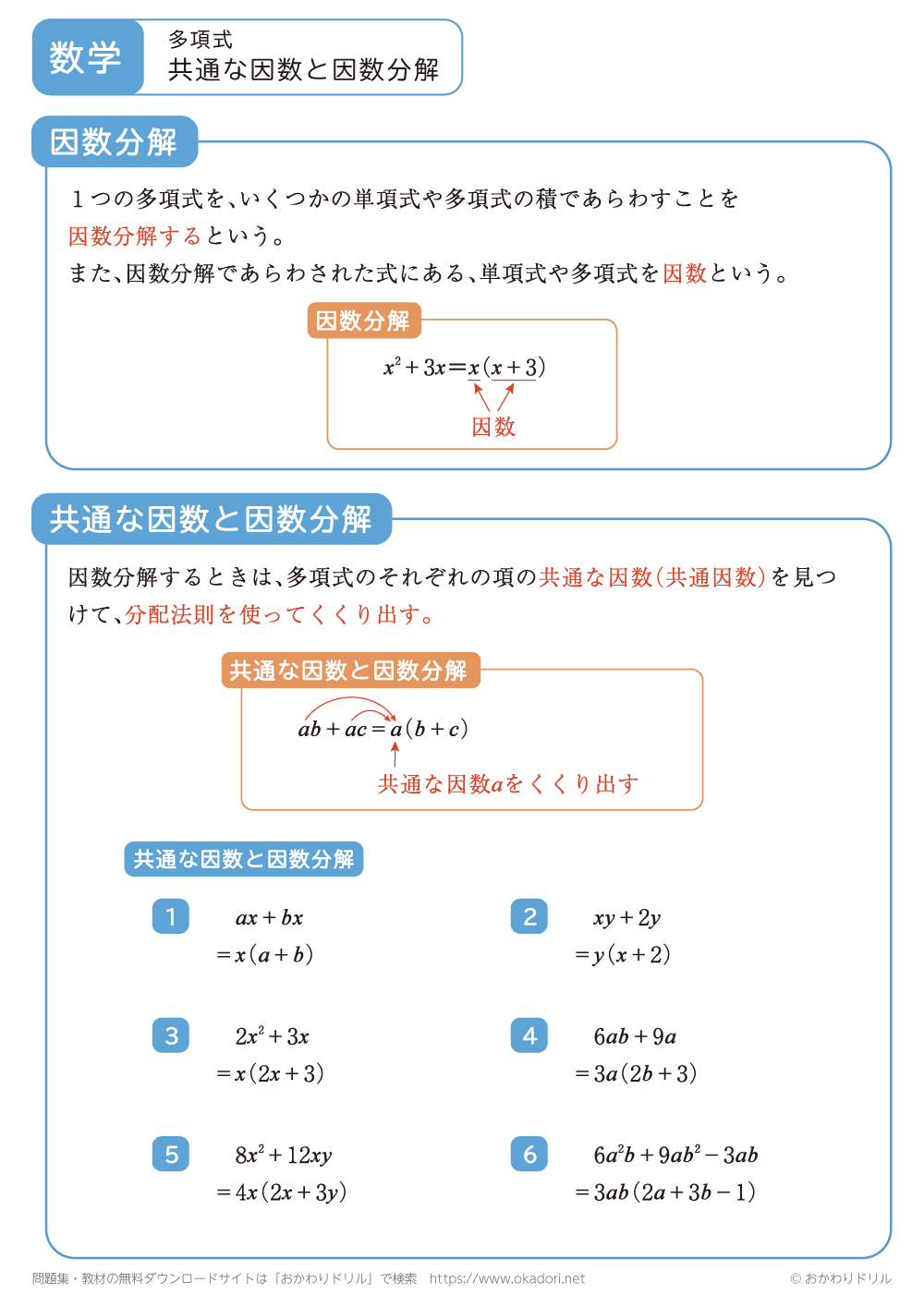 ・因数分解するときは、多項式のそれぞれの項の共通な因数(共通因数)を見つけて、分配法則を使ってくくり出します。