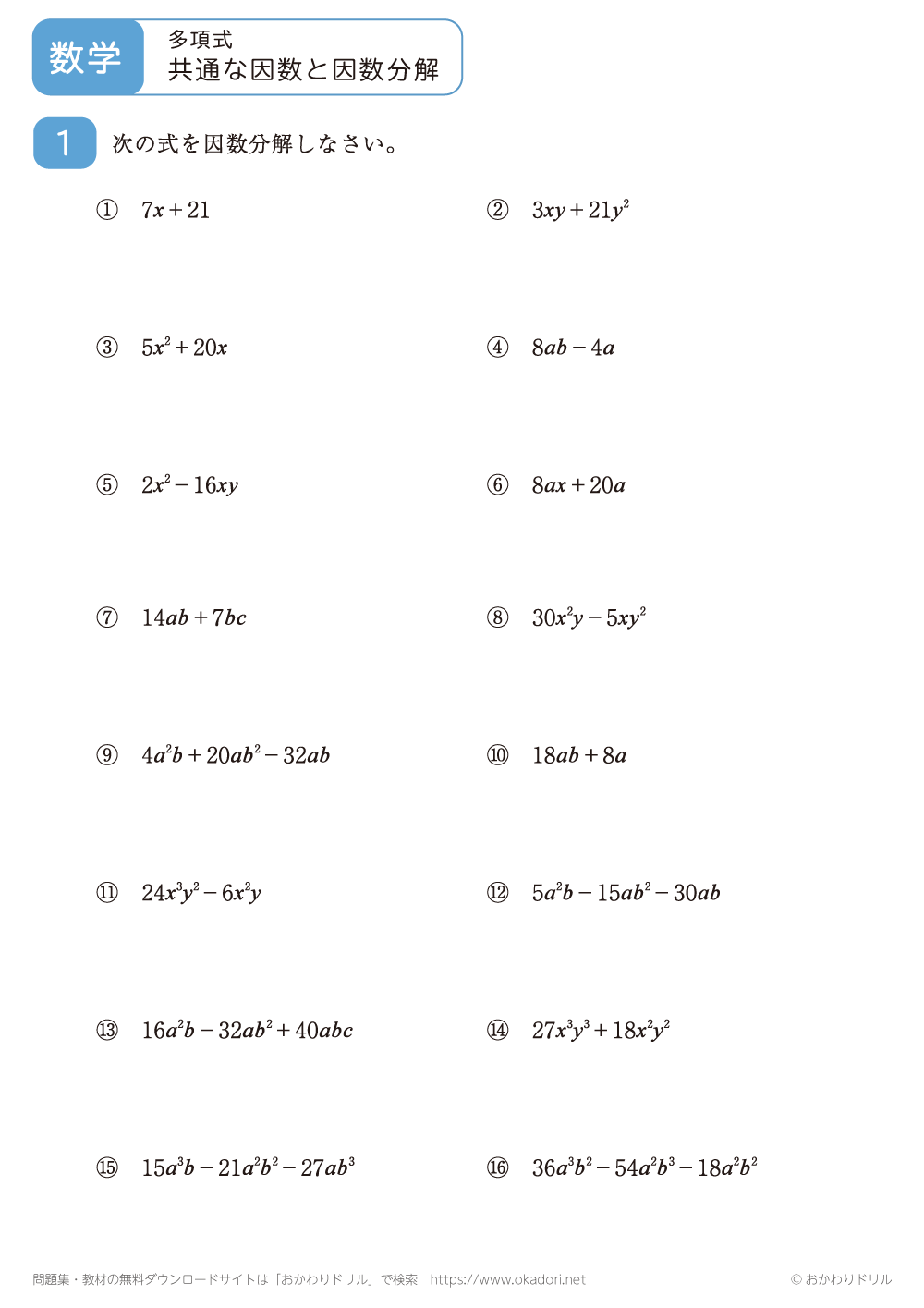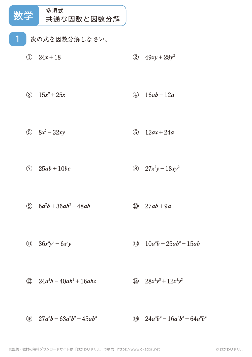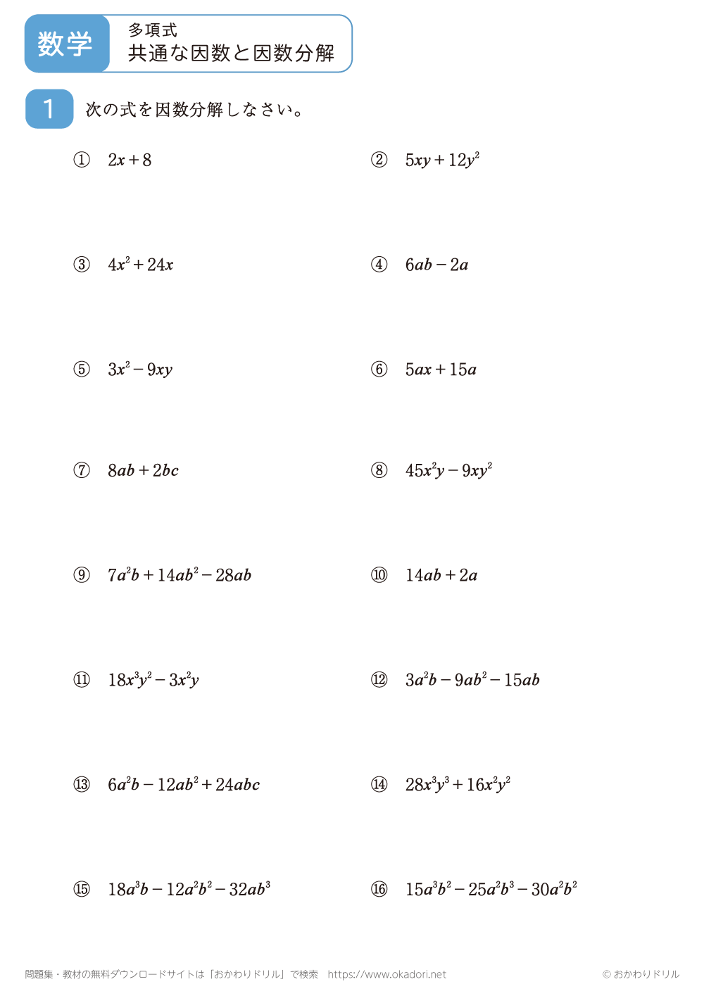 共通な因数と因数分解の問題です。多項式のそれぞれの項の共通な因数(共通因数)を見つけて、分配法則を使ってくくり出して問題を解いてみましょう。