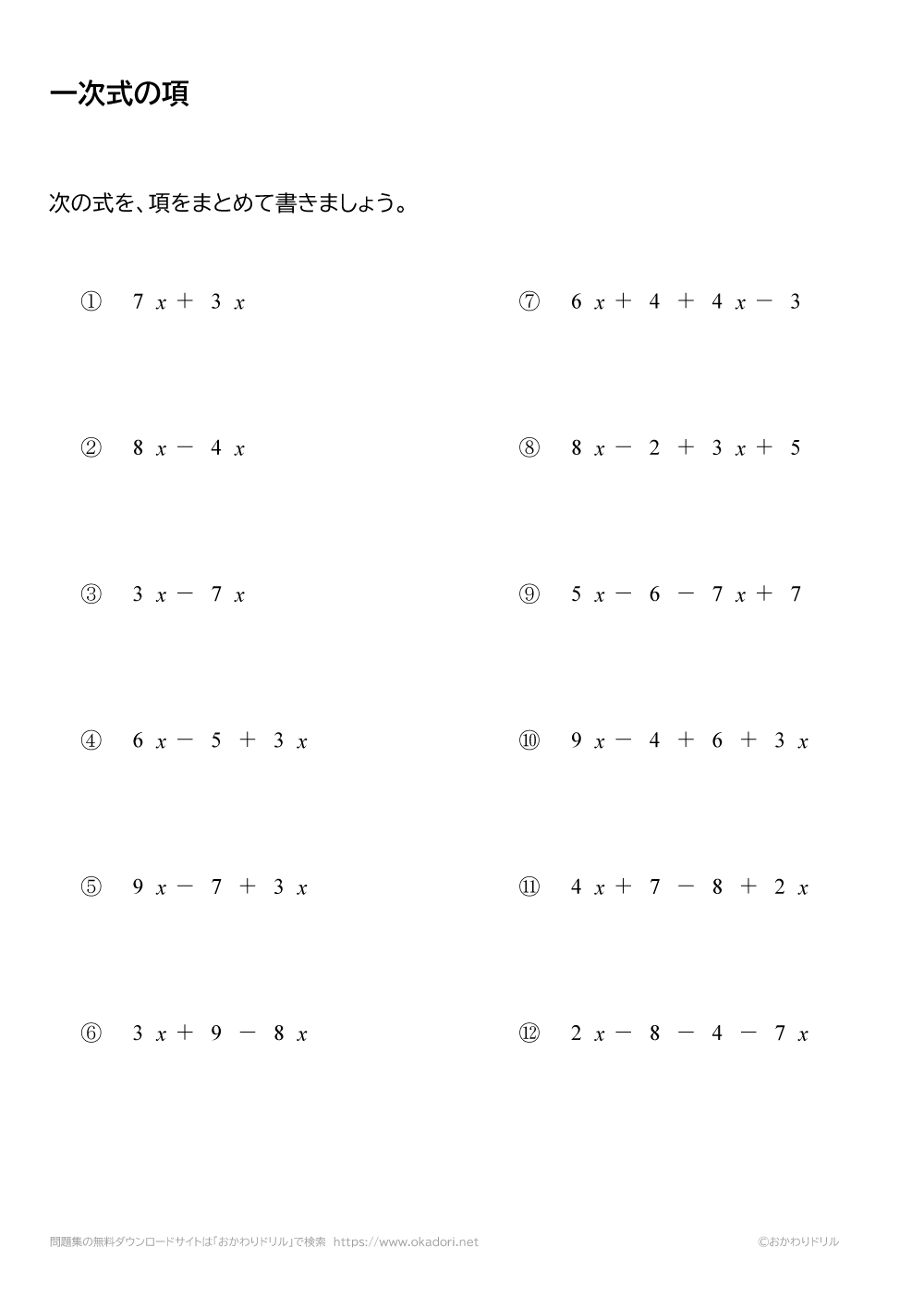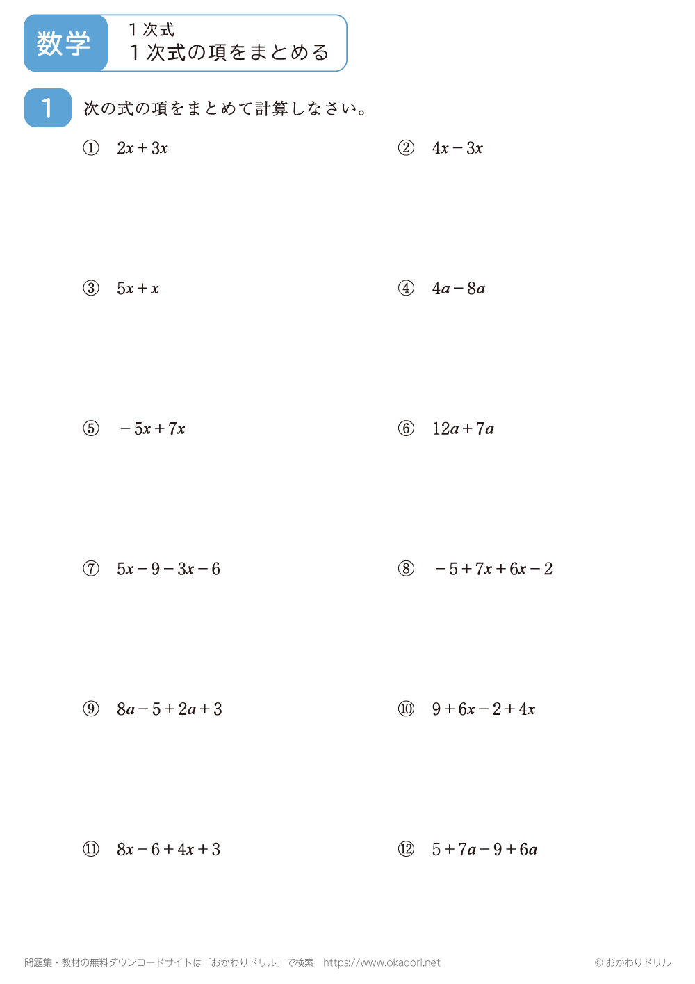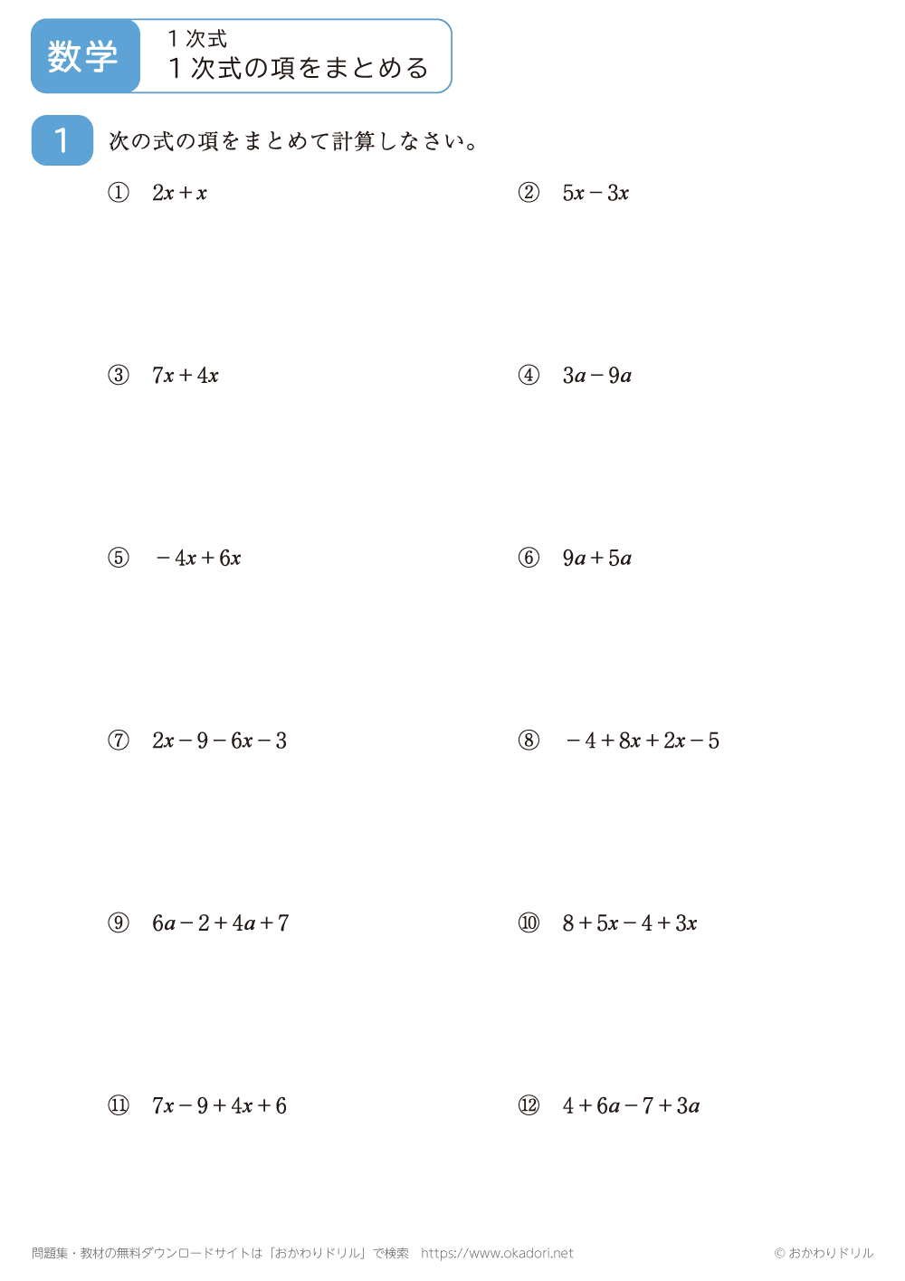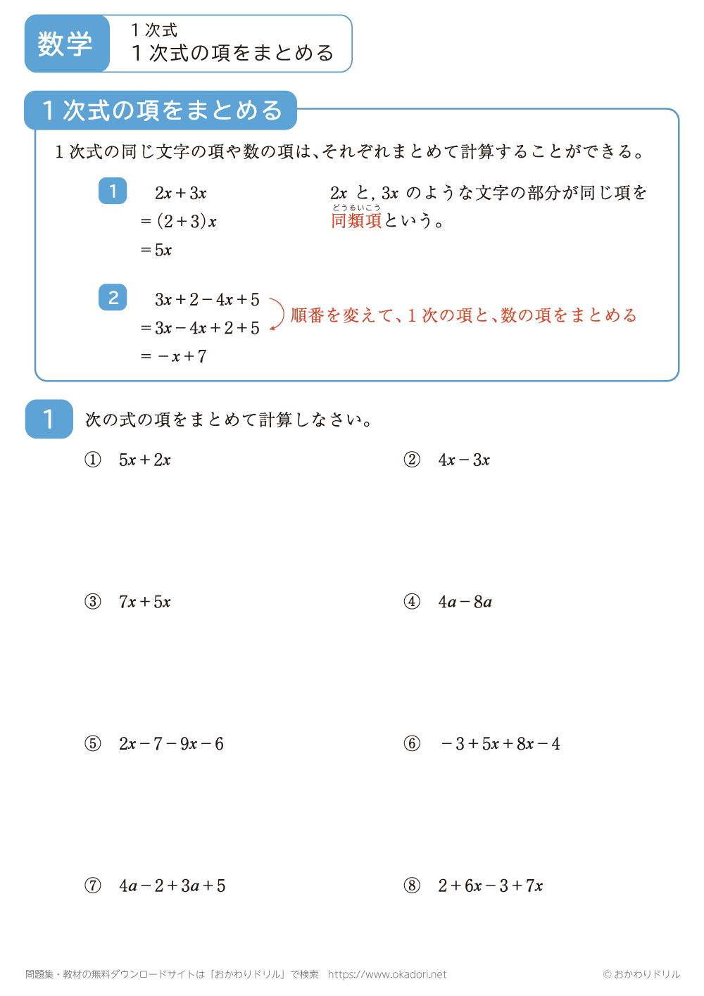 このページは、中学1年生で習う「1次式の項をまとめる」を学習できるページです。