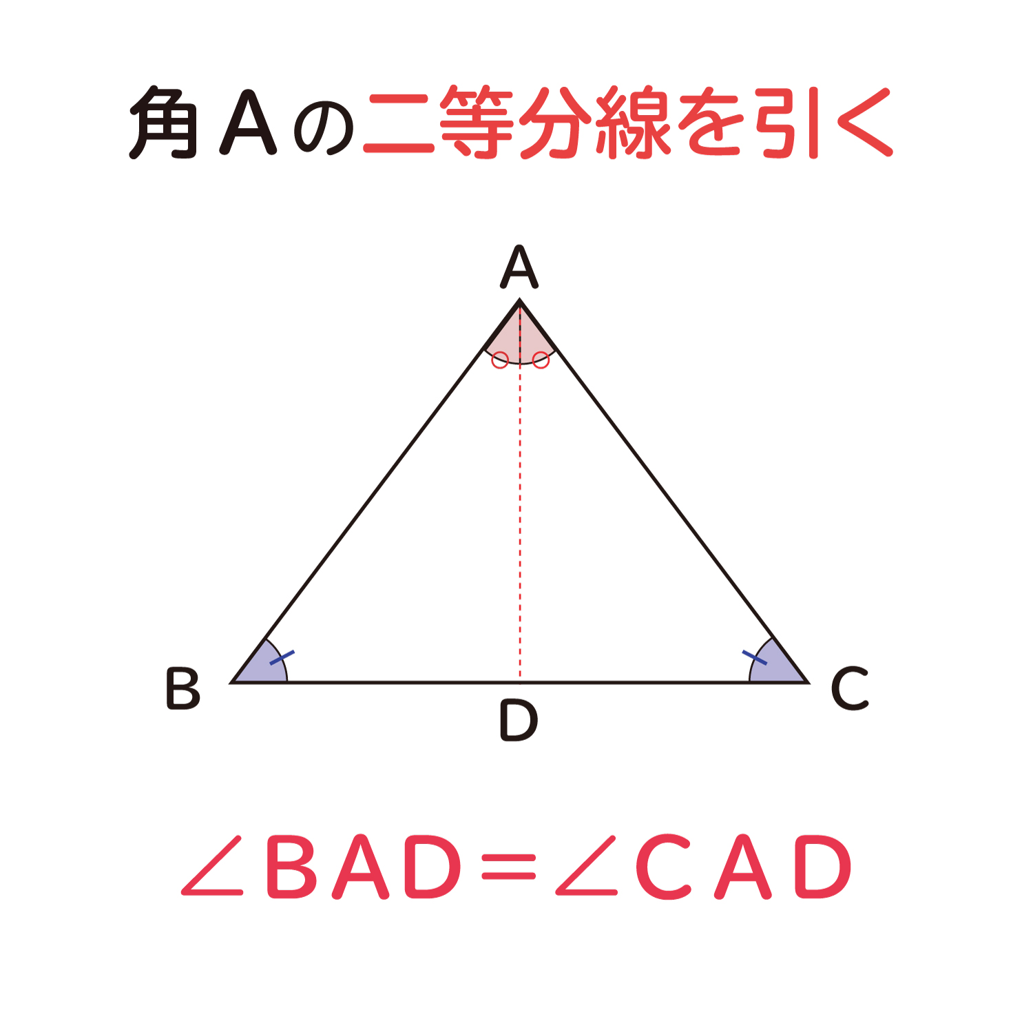 下の図のように、∠B=∠Cという2つの角が等しい三角形を考えます。ここで、∠Aの二等分線(Aの角度を2つに等しく分ける直線です)を引き、この直線と辺BCの交点を点Dとします。