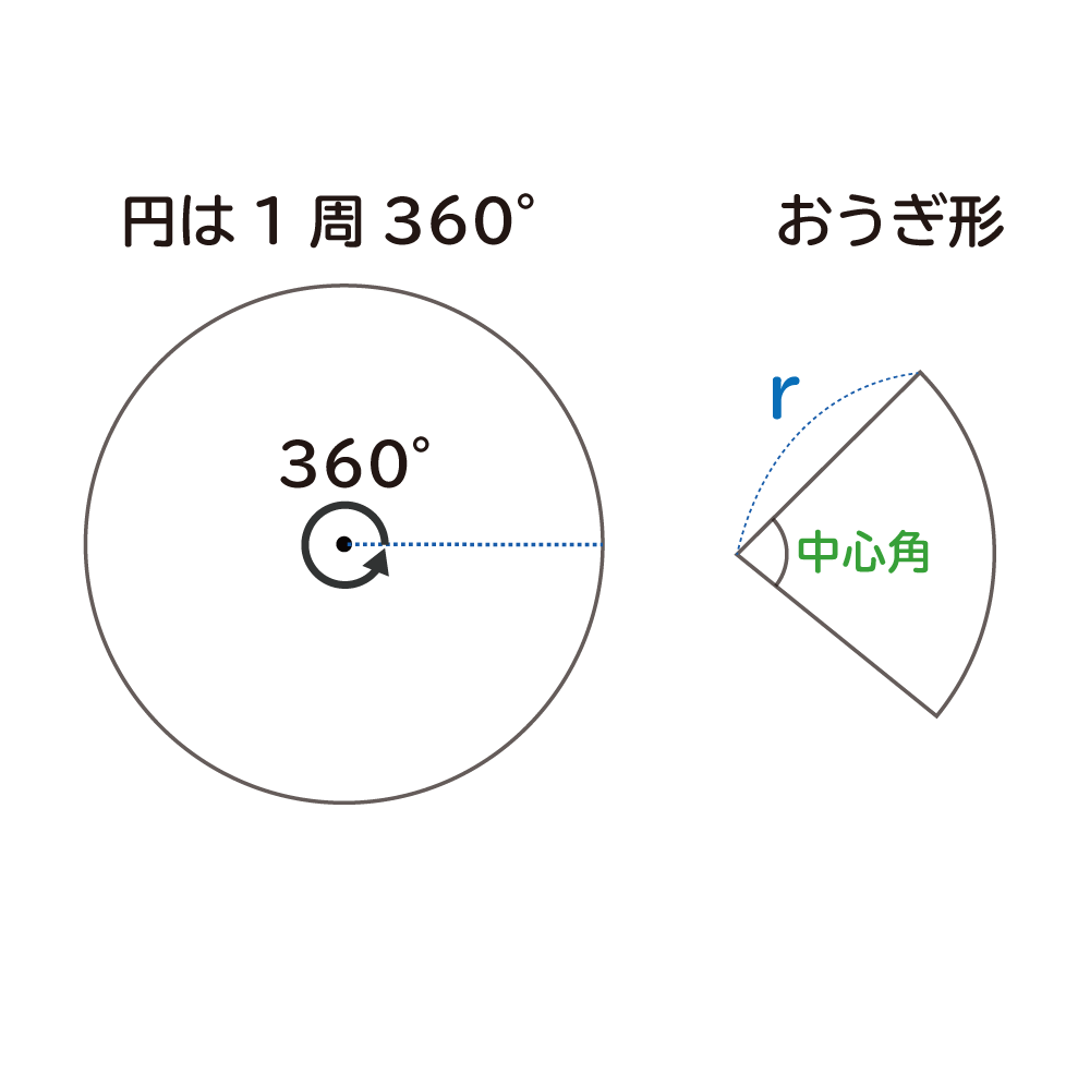 「おうぎ形の面積は、π×半径×半径×中心角/360」になる説明