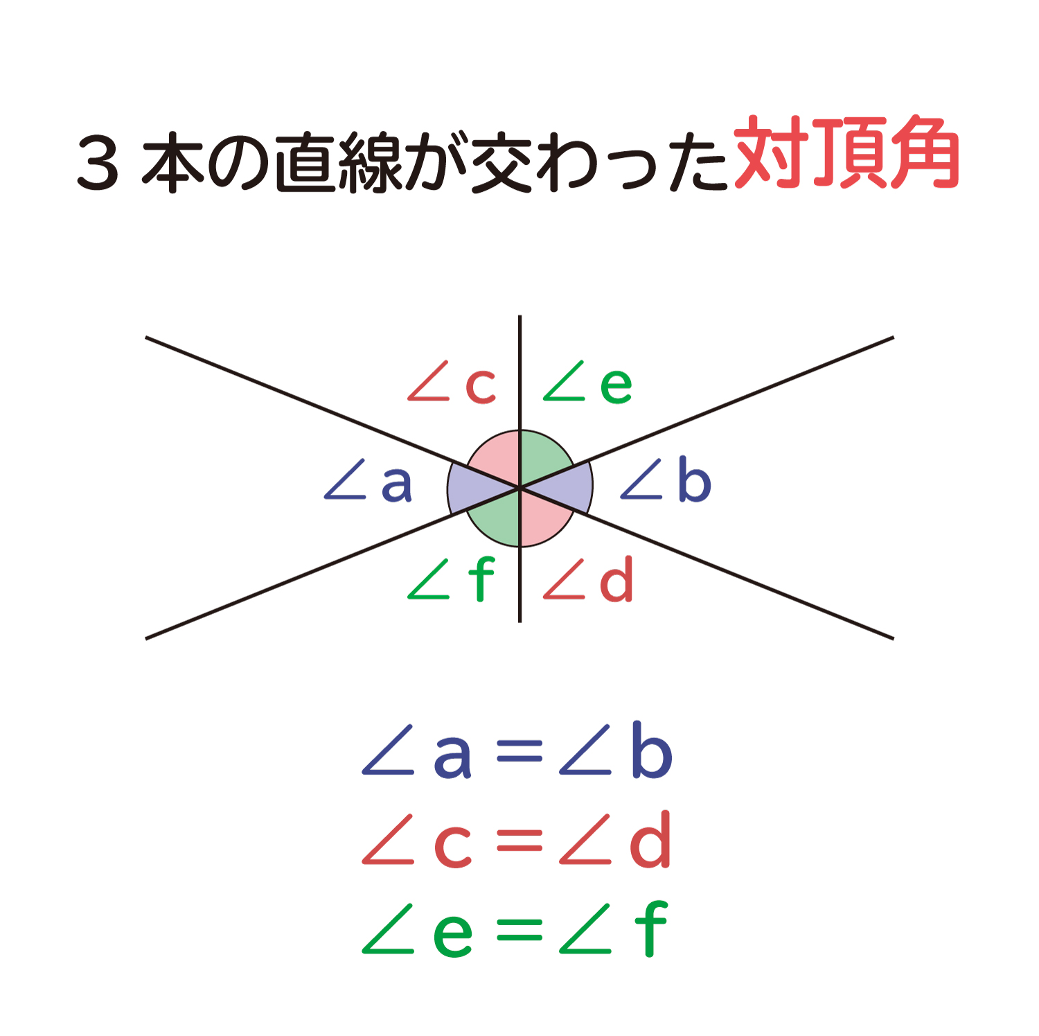 交わる直線が3本に増えても、それぞれの角が対頂角の関係になっているね!