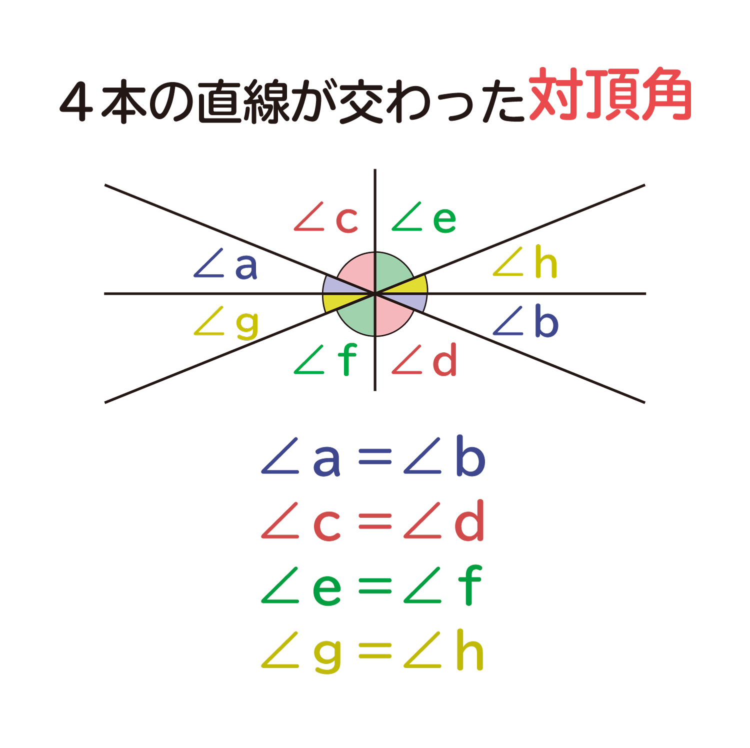 このように、同じ点で交わる直線の数が増えても、それぞれ角度が等しい対頂角ができます。中学校の数学では図形問題で対頂角を使う問題が出てくるので、ぜひ覚えておいてくださいね。