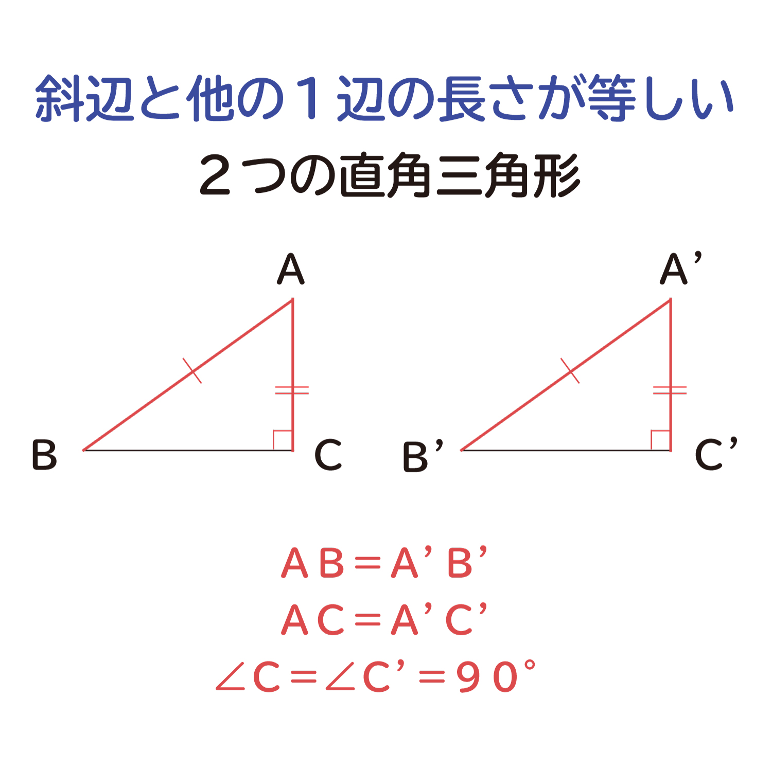 最初に、直角三角形の合同条件の1つ目「斜辺と他の1辺の長さが等しい」を確認していきます。