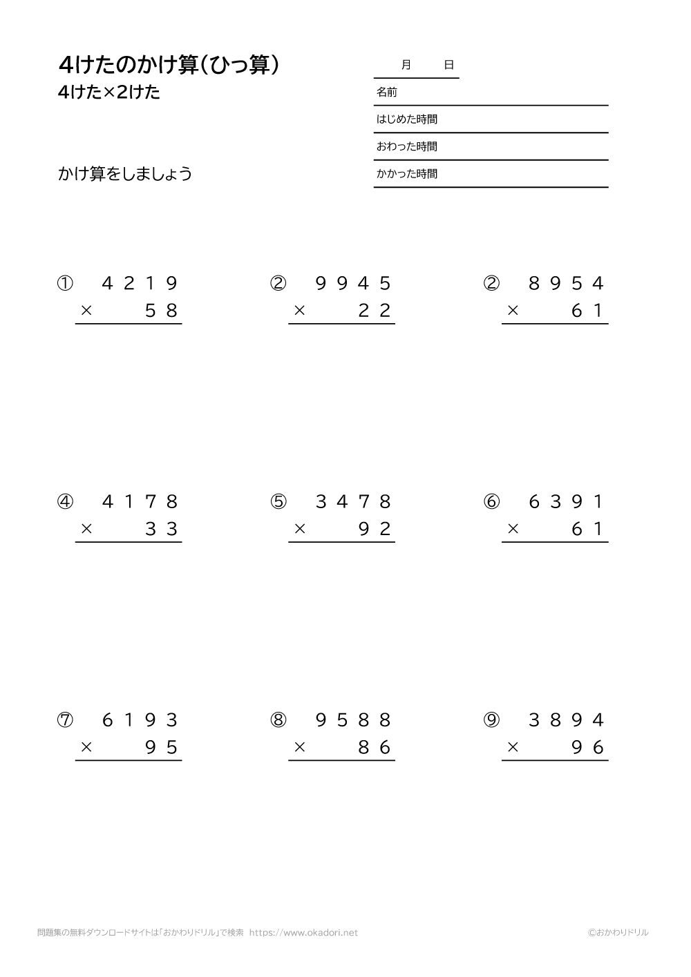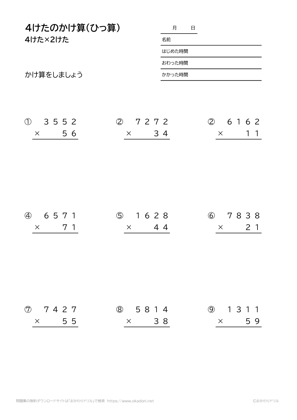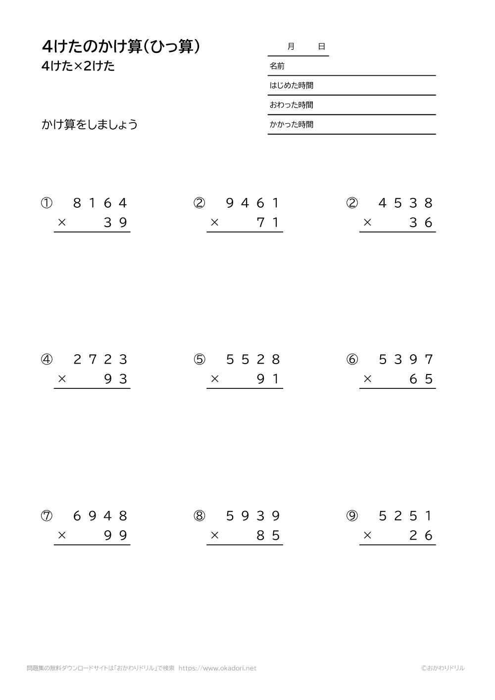 4桁と2桁の掛け算の問題です。繰り上がる場合は、繰り上がりに注意して掛け算を解く問題です。