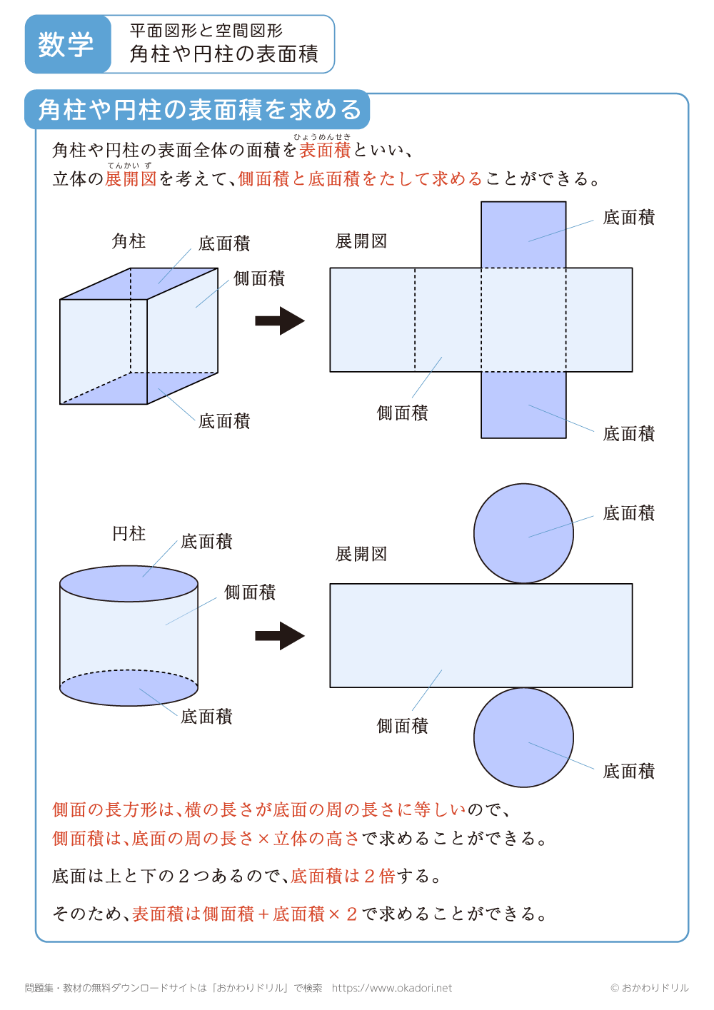 ・角柱や円柱の表面全体の面積を表面積といいます。