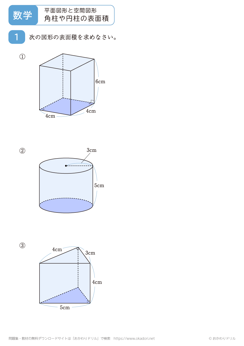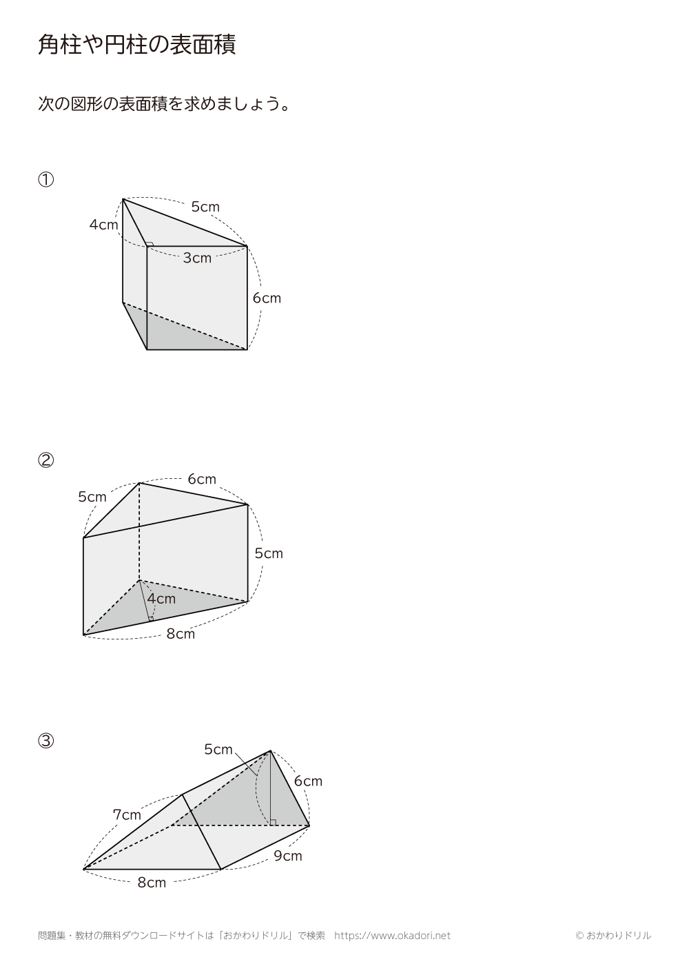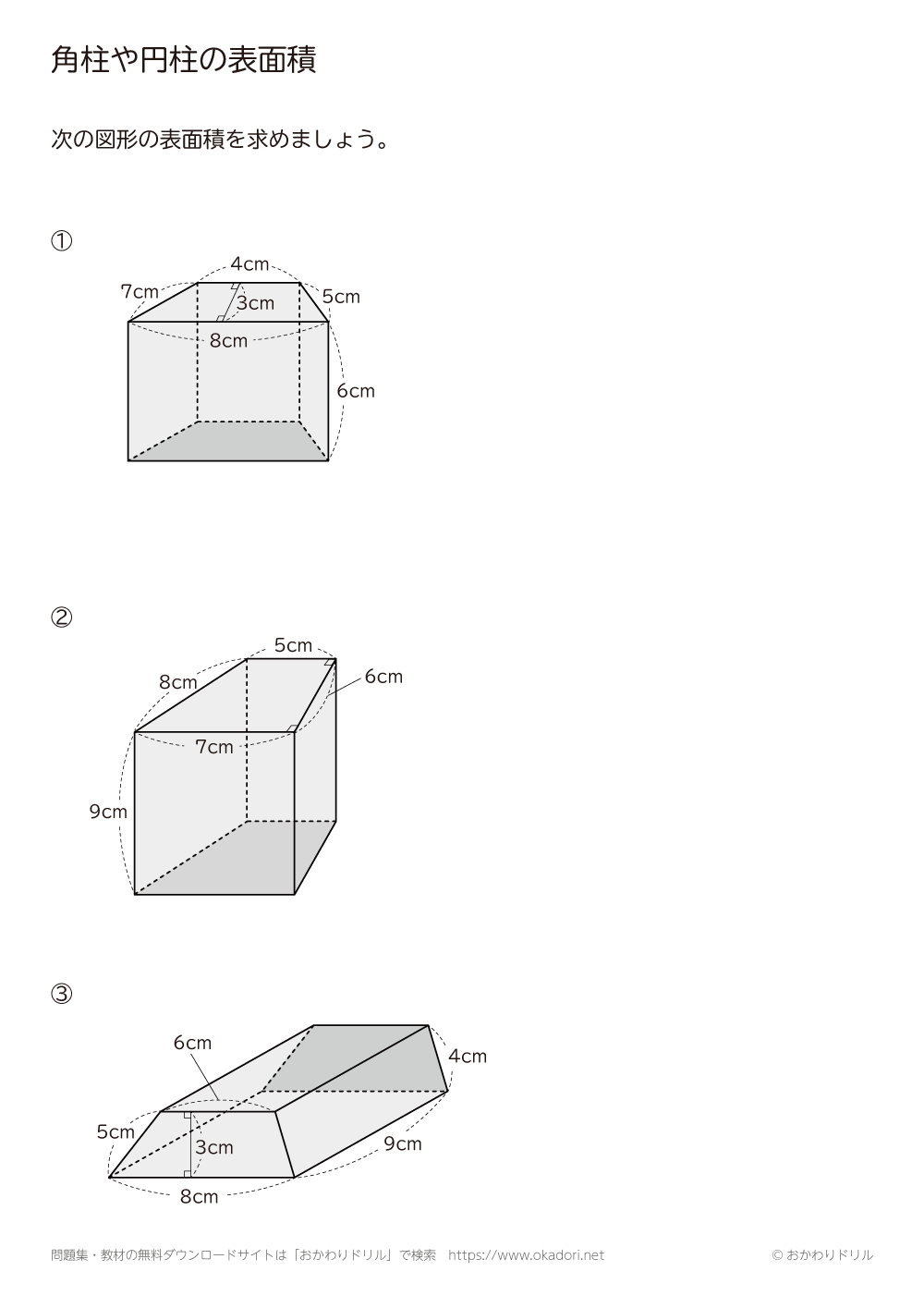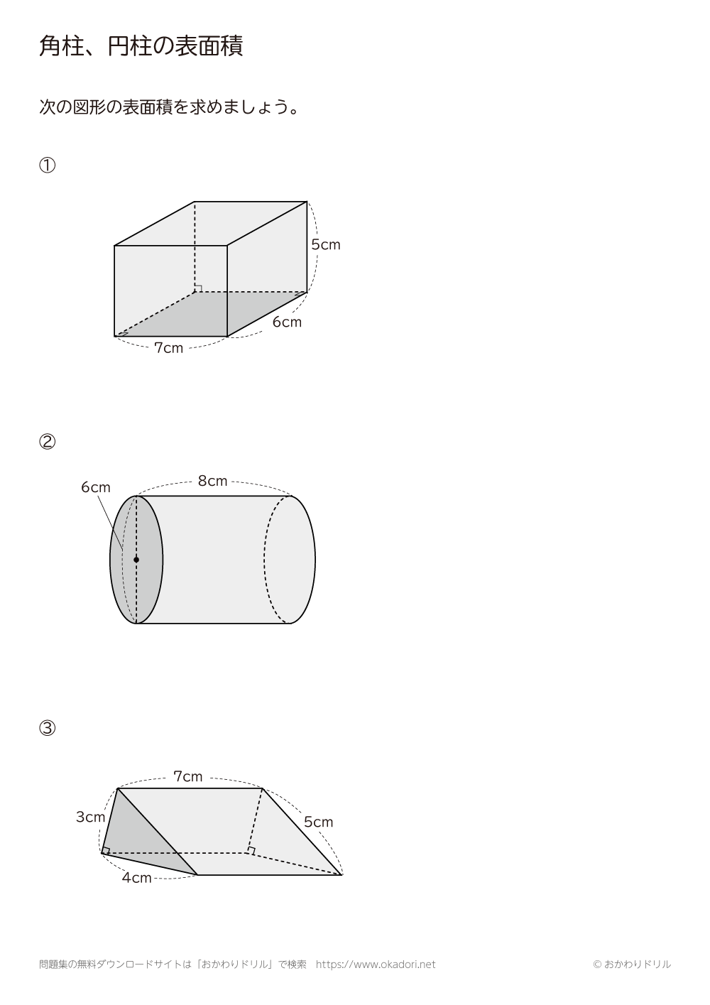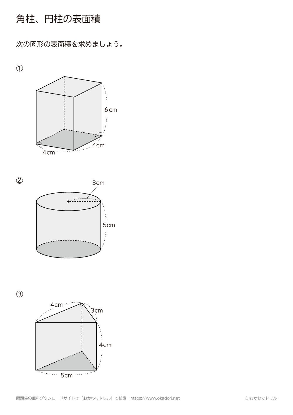 角柱や円柱の表面積を求める問題です。角柱や円柱の表面積は、側面積+底面積×2で求めることができます。