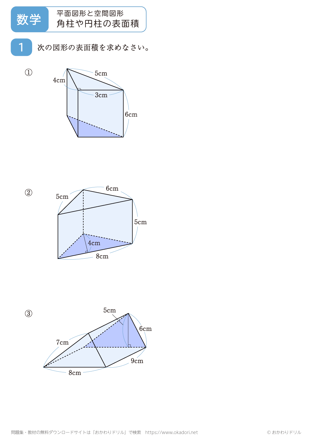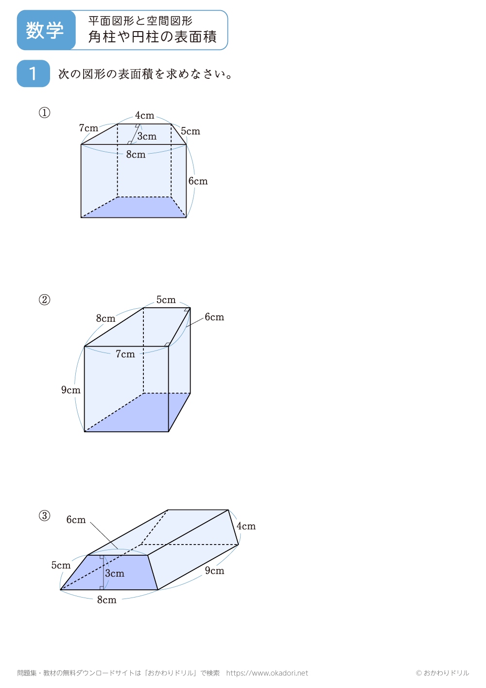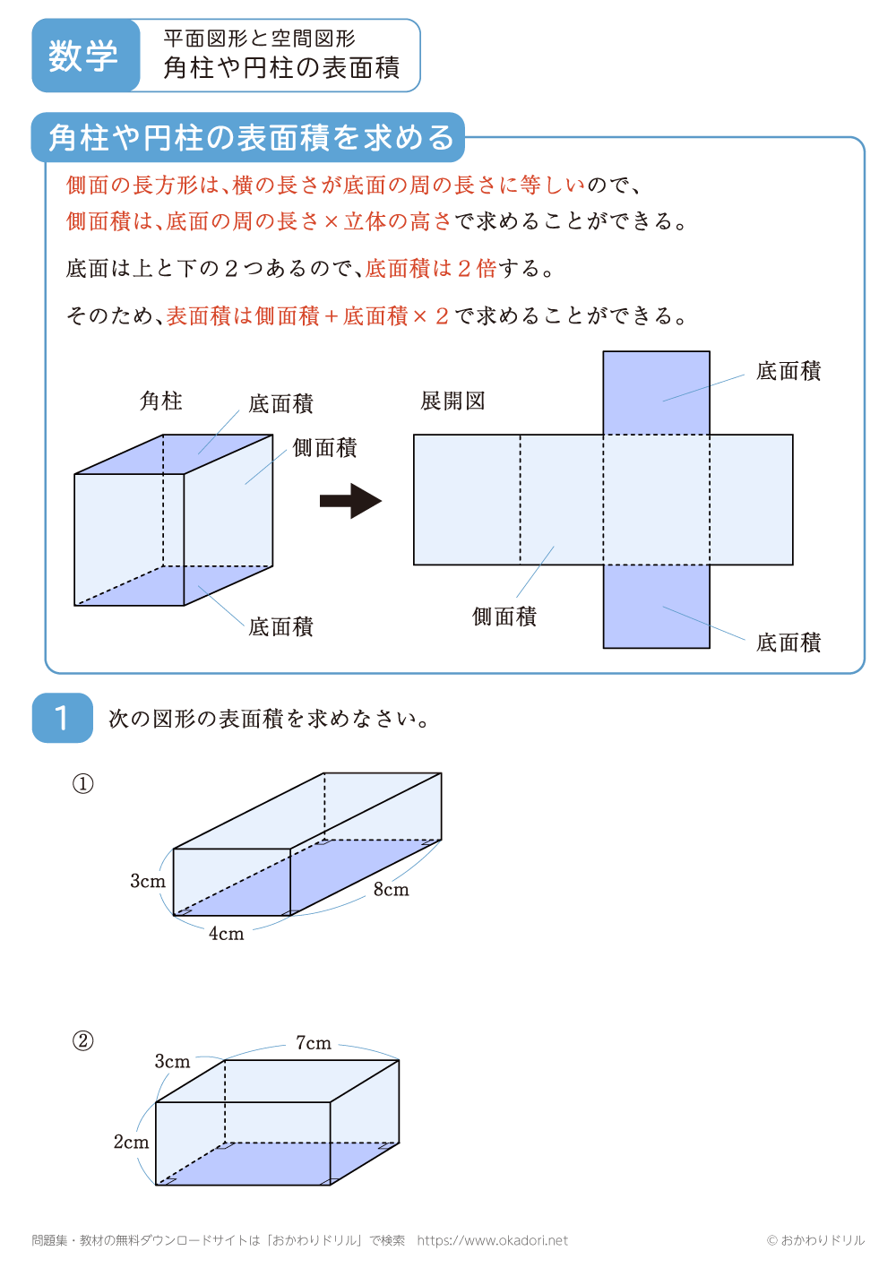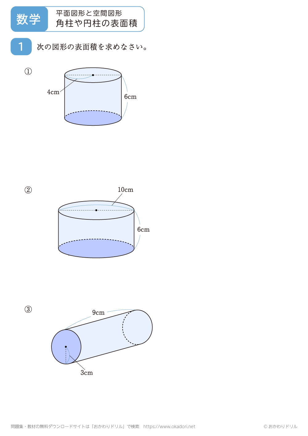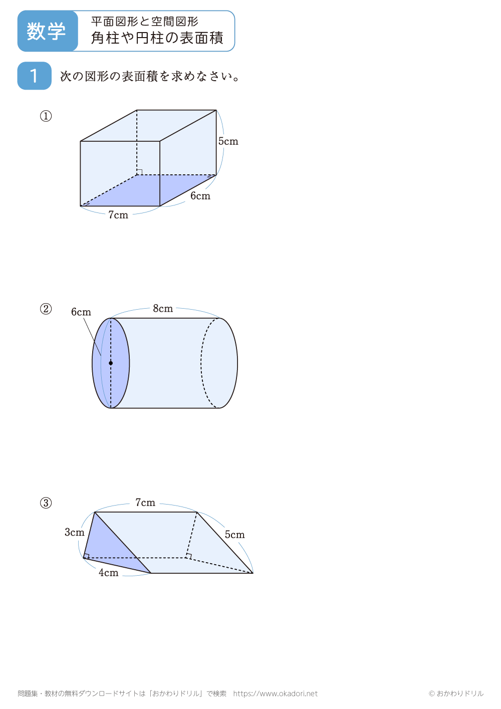角柱や円柱の表面積を求める問題です。角柱や円柱の表面積は、側面積+底面積×2で求めることができます。