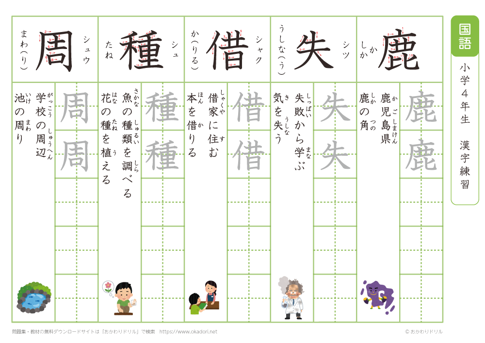 HOME > 小学生 > 《 国語 》小学4年生 > 《 国語 》小学4年生 《 漢字一覧 》小学生 「失」の読み方・画数・例文|小学4年生の漢字 2023年11月14日 失 学年 小学4年生 画数 5画 部首 だい 読み 【音】シツ、【訓】うしな(う) 例文 失敗(しっぱい)から学(まな)ぶ、気(き)を失(うしな)う ※この例文では対象の学年までに習った漢字のみを使って記載するようにしています。 -《 国語 》小学4年生, 《 漢字一覧 》小学生