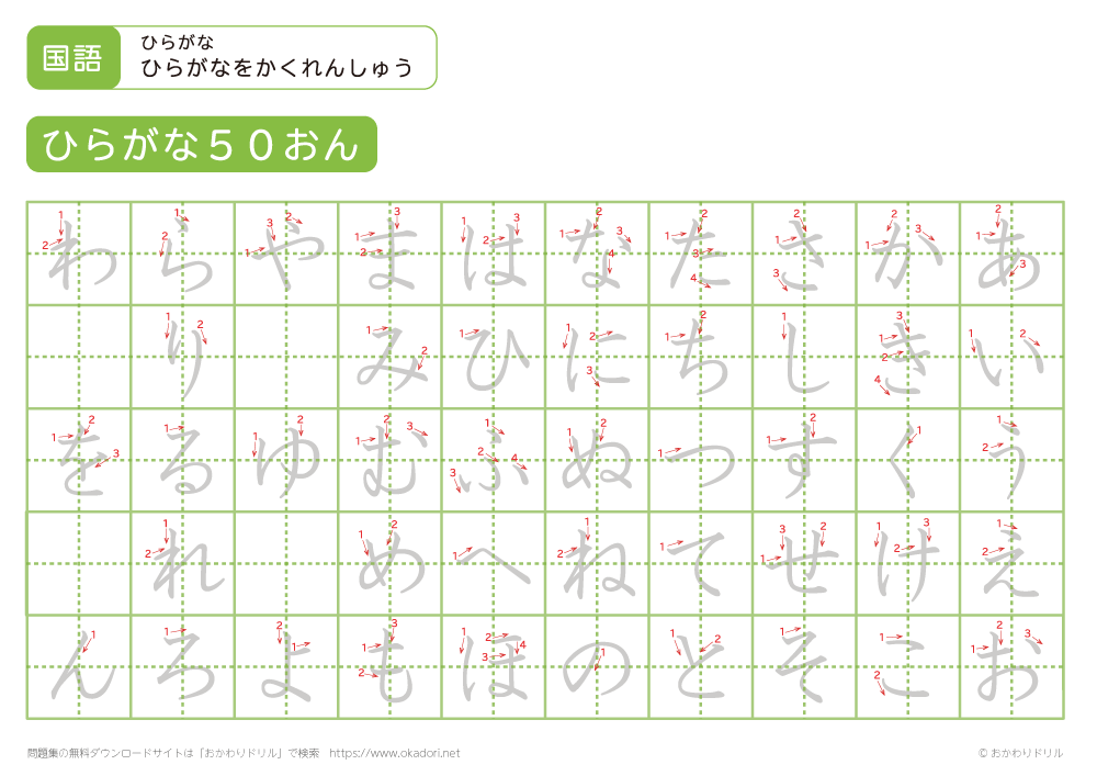 このページは、小学1年生で習う「ひらがな50音」の書き方を練習できる教材が無料で ...