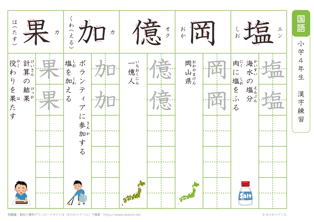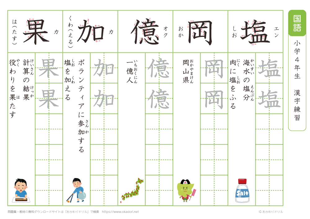 このページは、小学4年生で習う読みが「あ~か」の漢字30字の書き方を練習できる教 ...