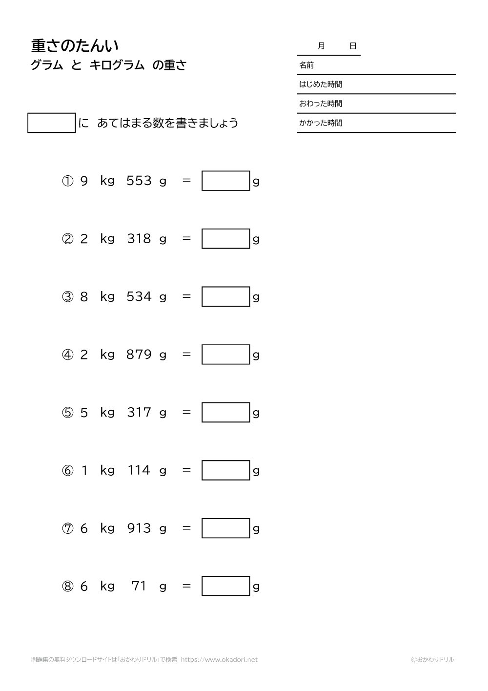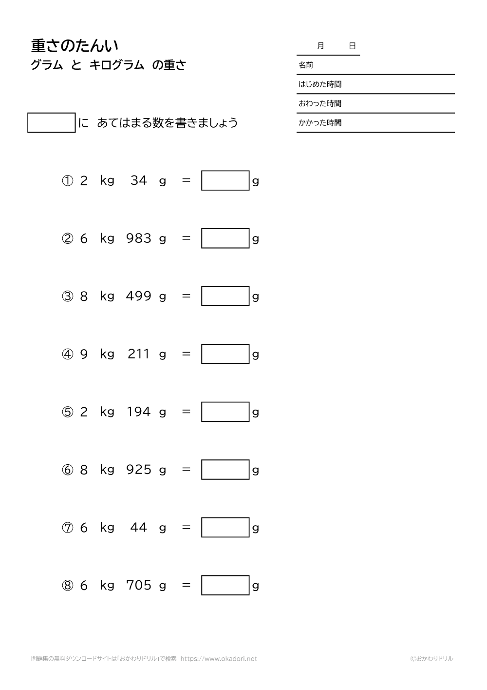 小学3年生では、キログラムなど重さの単位を勉強します。この問題ではキログラムとグラムの関係について学びます。