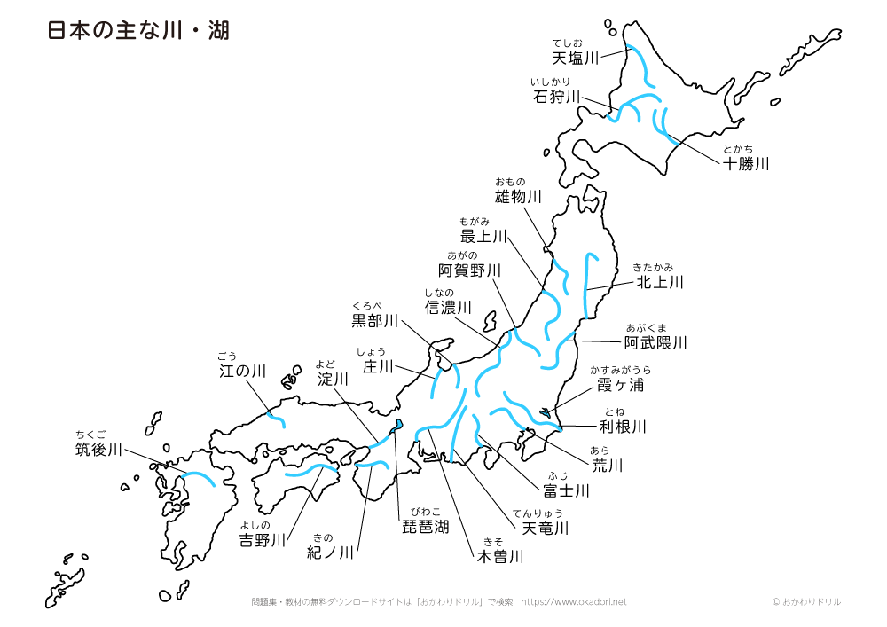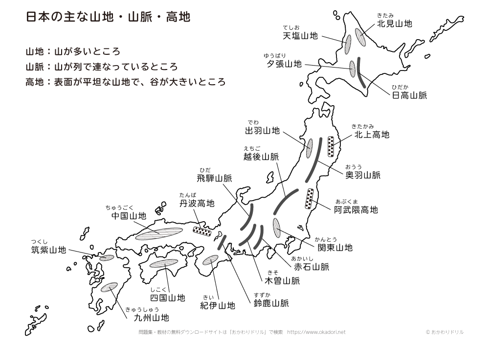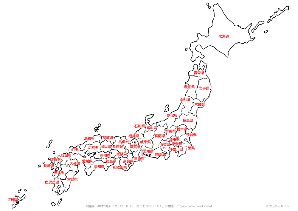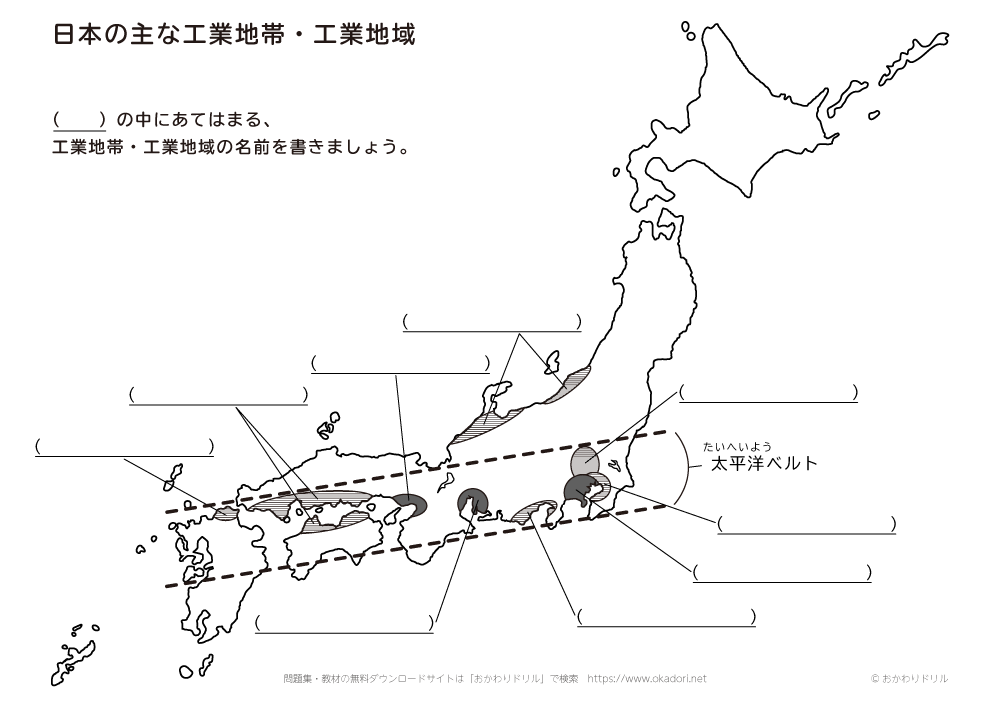 工業地帯・工業地域の名前と位置を書いたプリントを用意しています。工業地帯・工業地域の名前を覚えたかテストしたい時には、名前を消して問題にしているプリントもあるので、利用してみて下さい。