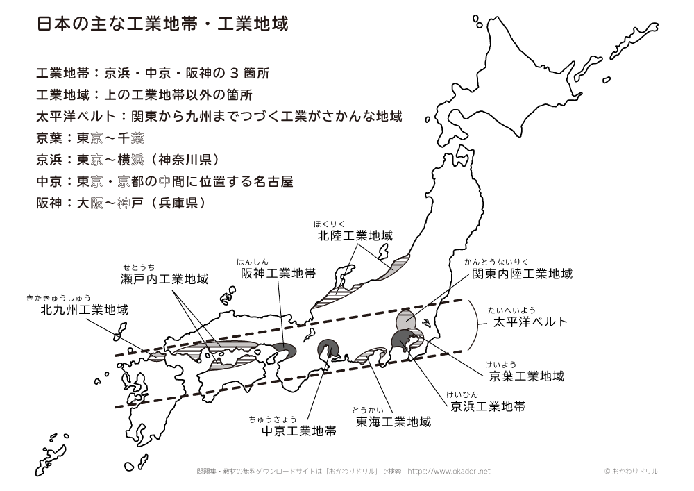 ・小学校の社会では、日本の主な工業地帯・工業地域を覚えます。