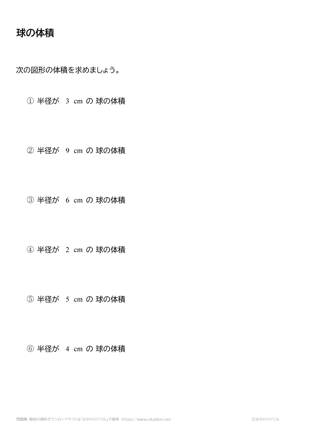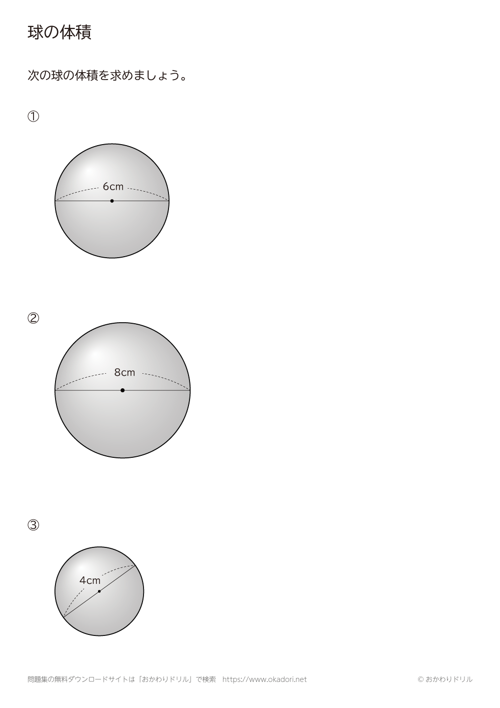 球の体積を求める問題です。球の体積は、4/3×πr3で求めることができます。