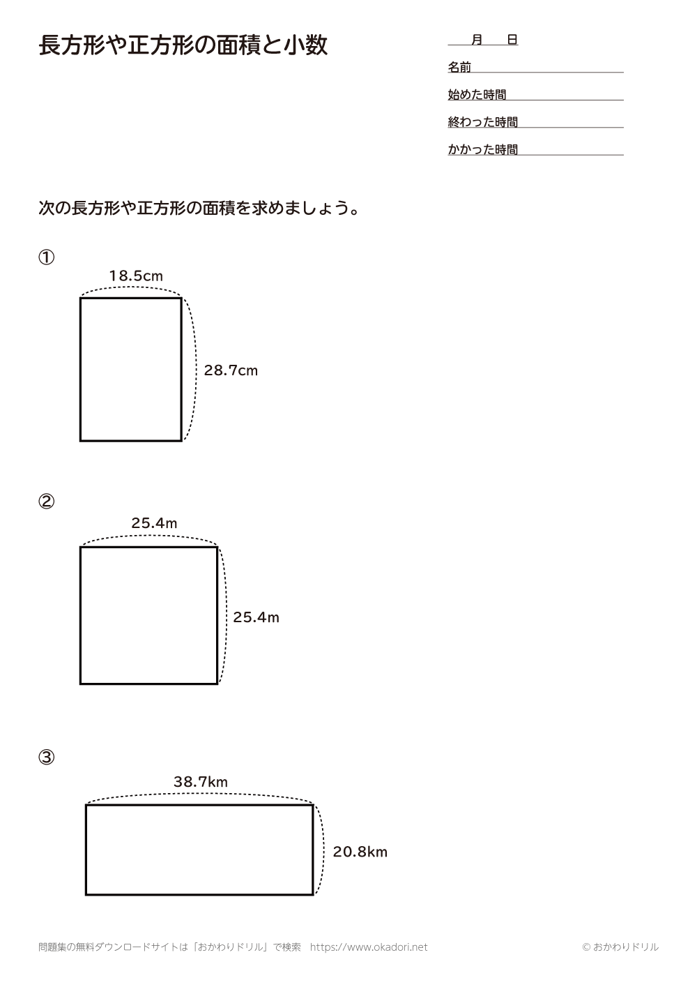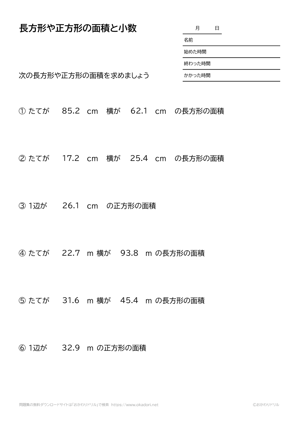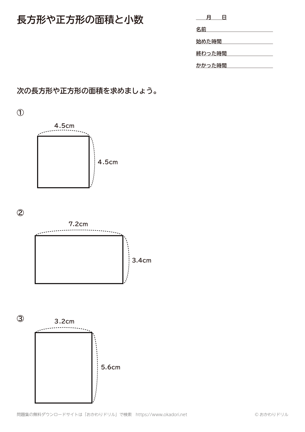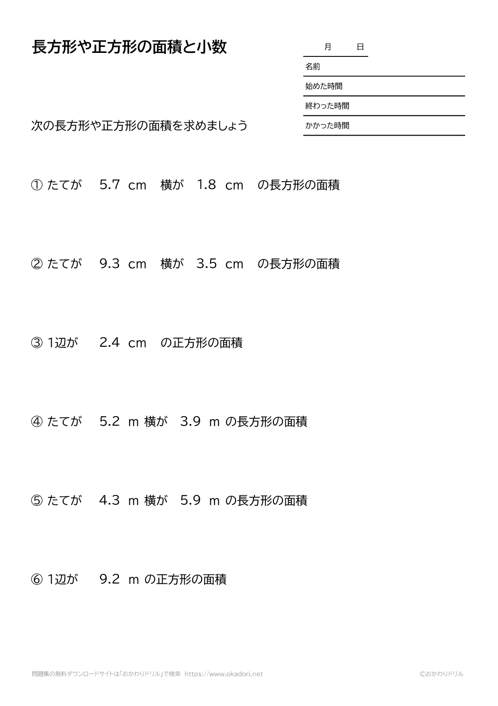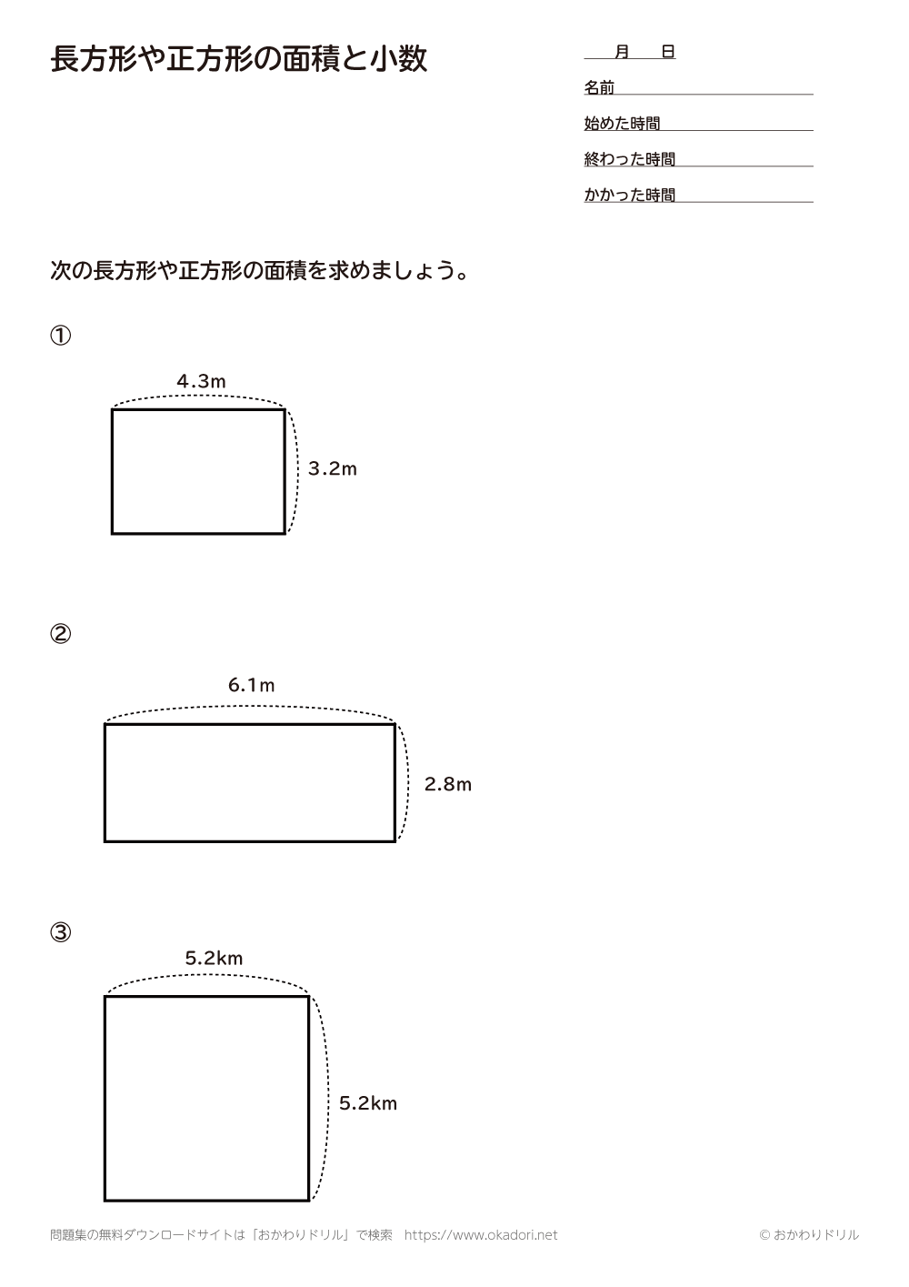 辺の長さが小数で表された長方形や正方形も、面積は「たて×よこ」の公式を使って求めることができます。小数点の位置や面積の単位に注意して問題を解いてみましょう。
