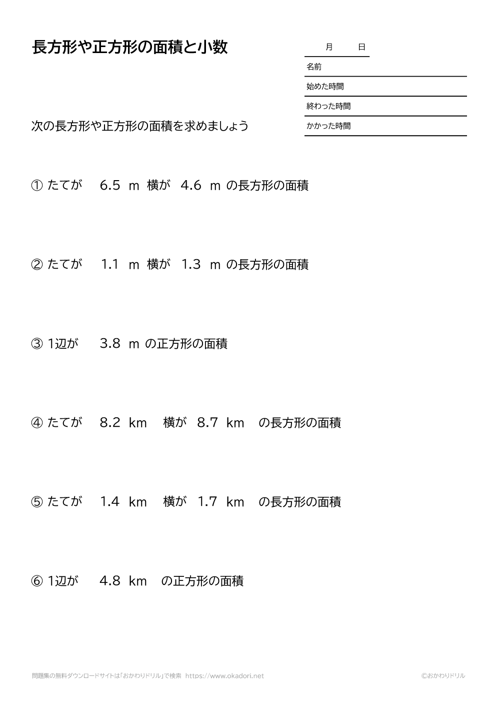 このページは、小学5年生が小数の面積を学習するための「辺の長さが小数の長方形や正方形の面積」が学習できるページです。