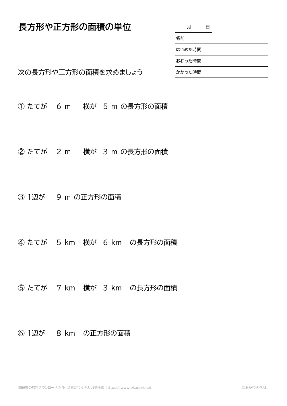 いろいろな大きさの長方形や正方形の面積を求めます。どの単位で面積を求めるかに注意して問題を解いてみましょう。