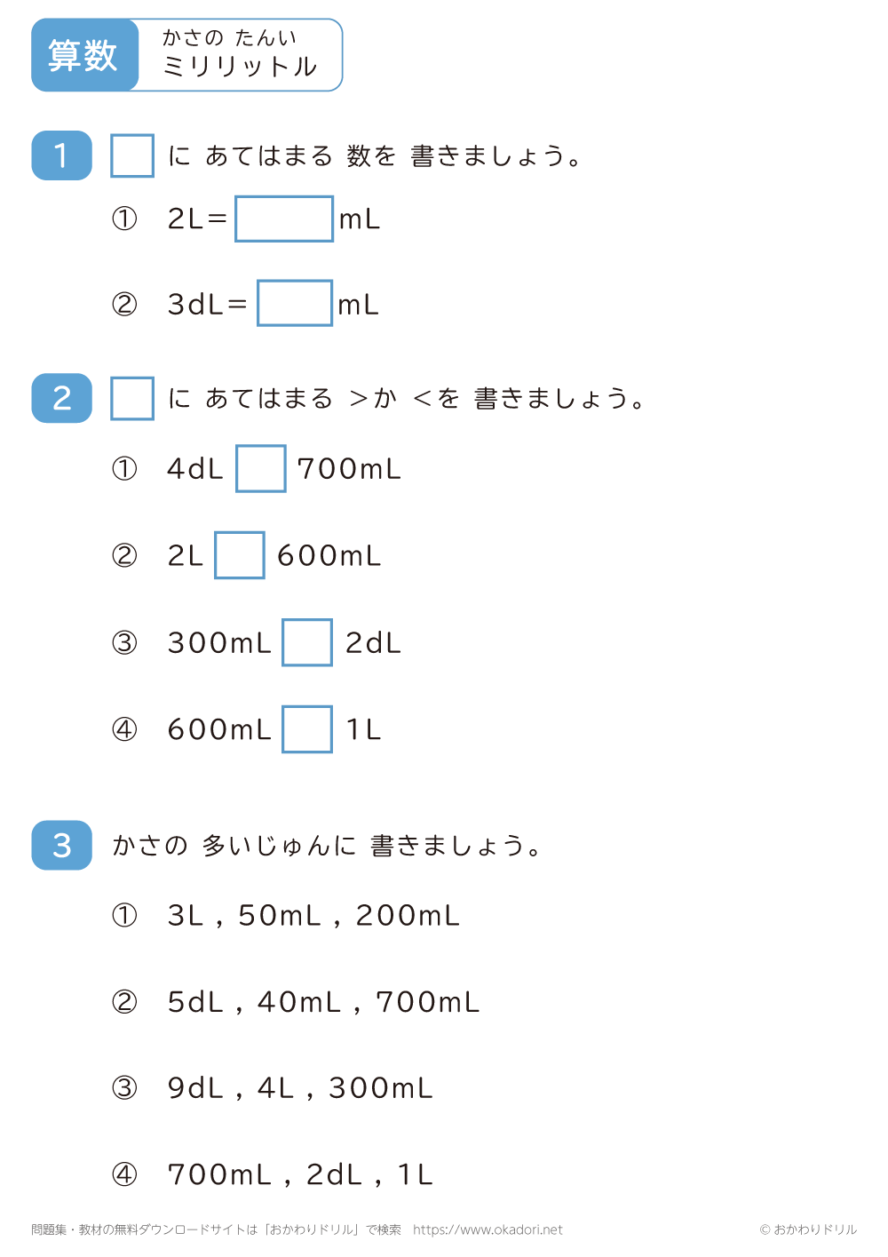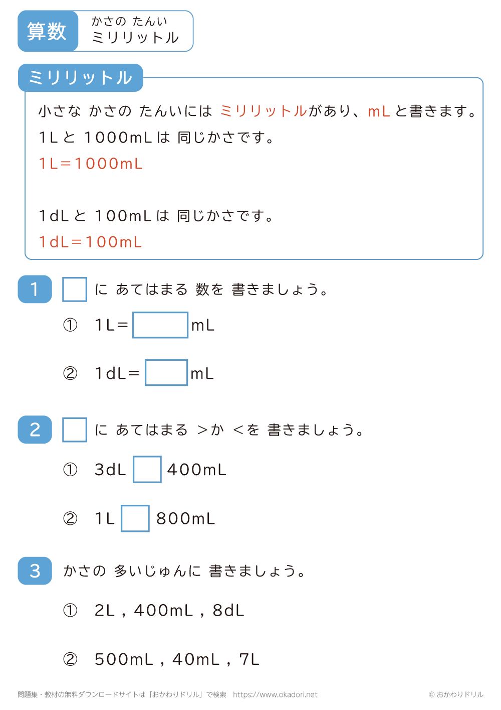このページは、小学2年生で習う「ミリリットル」が学習できるページです。