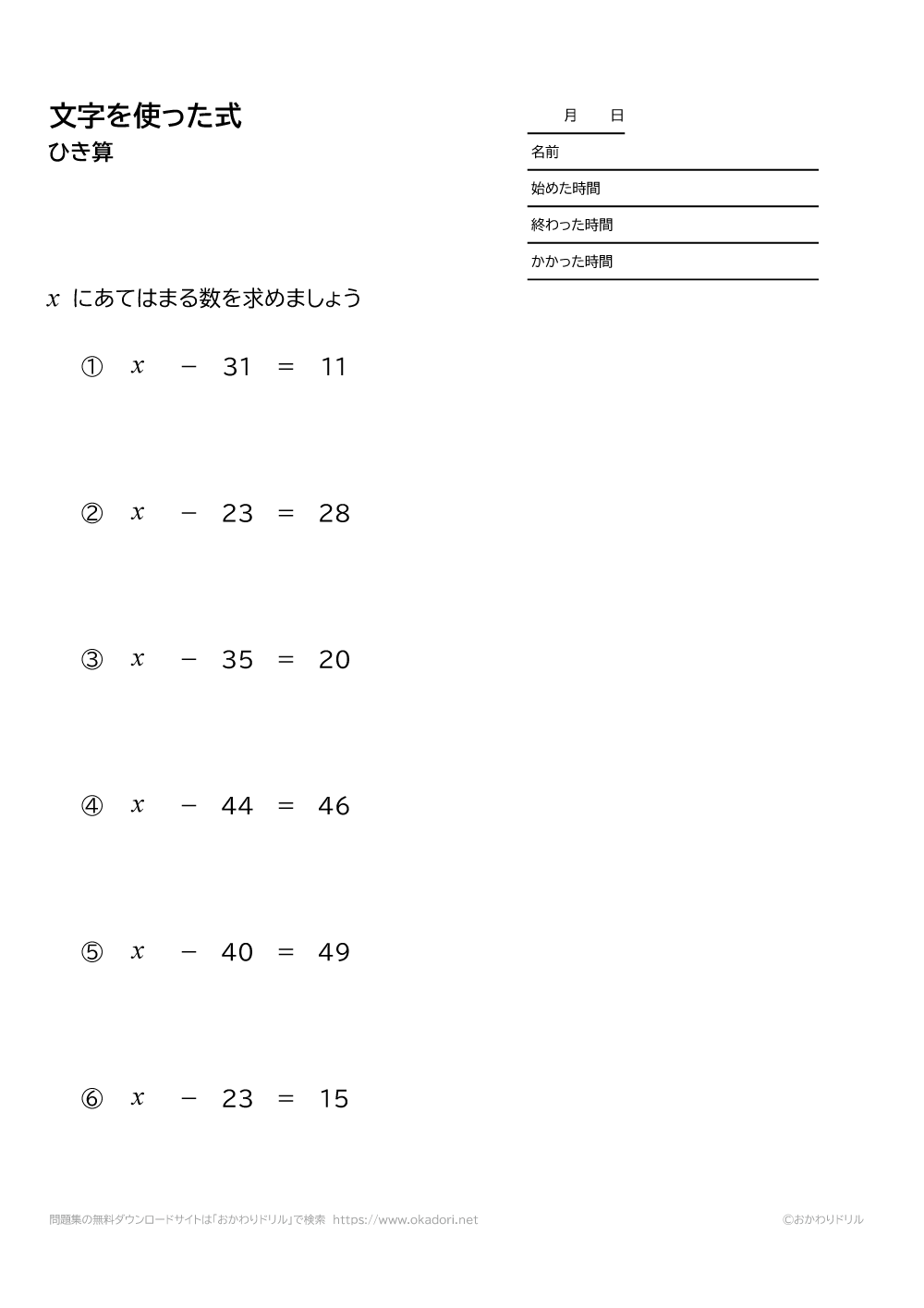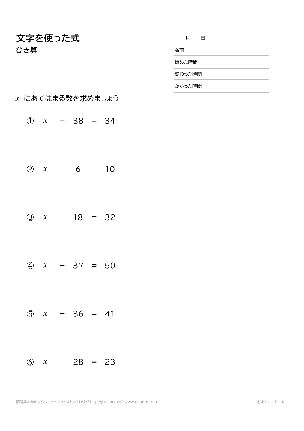 このページは、小学6年生で習う「文字を使った式の引き算」が学習できるページです。