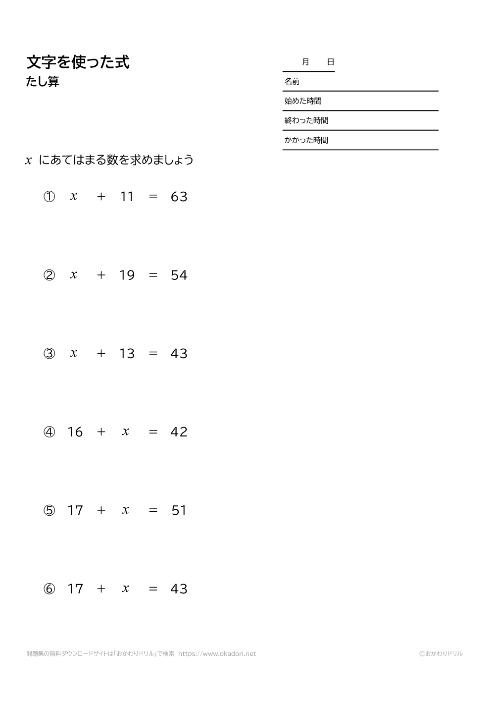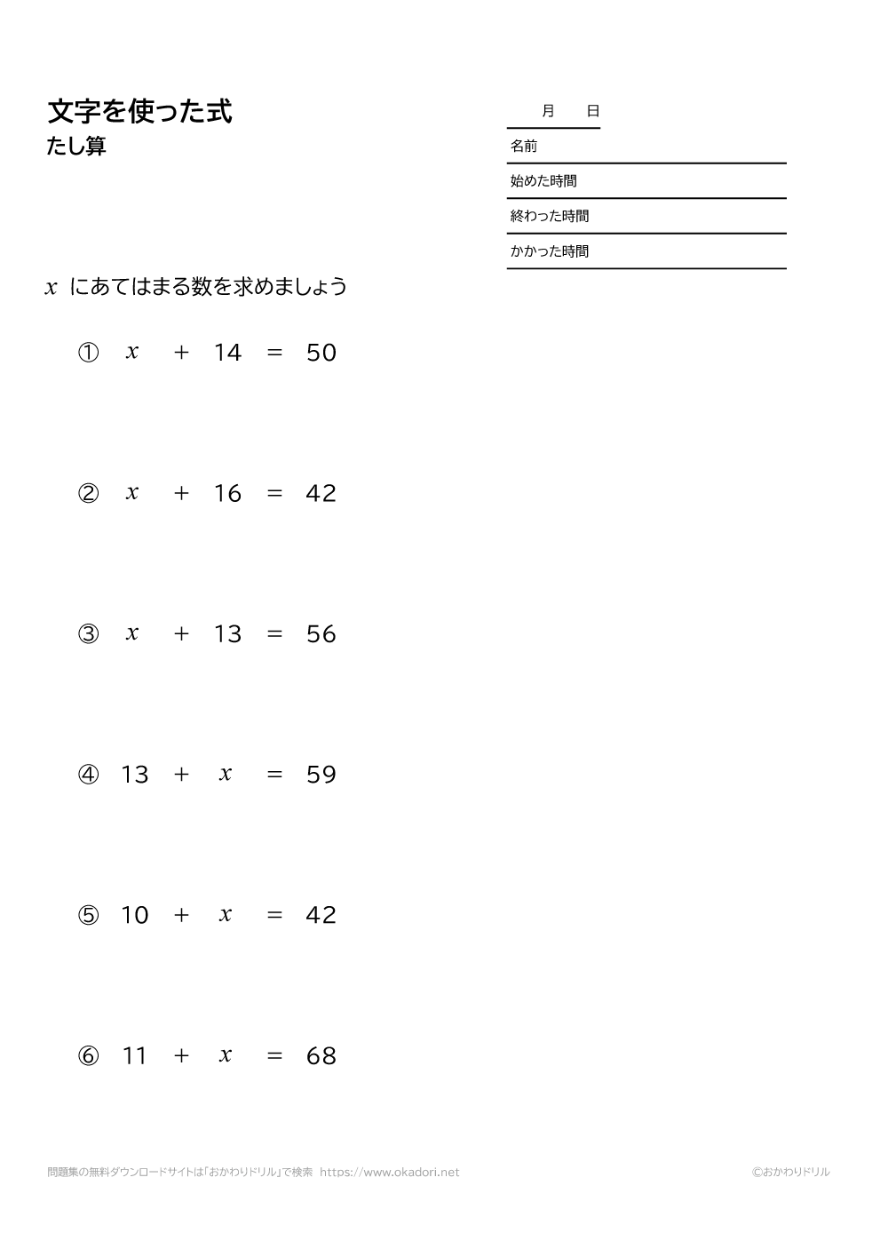 このページは、小学6年生で習う「文字を使った式の足し算」が学習できるページです。