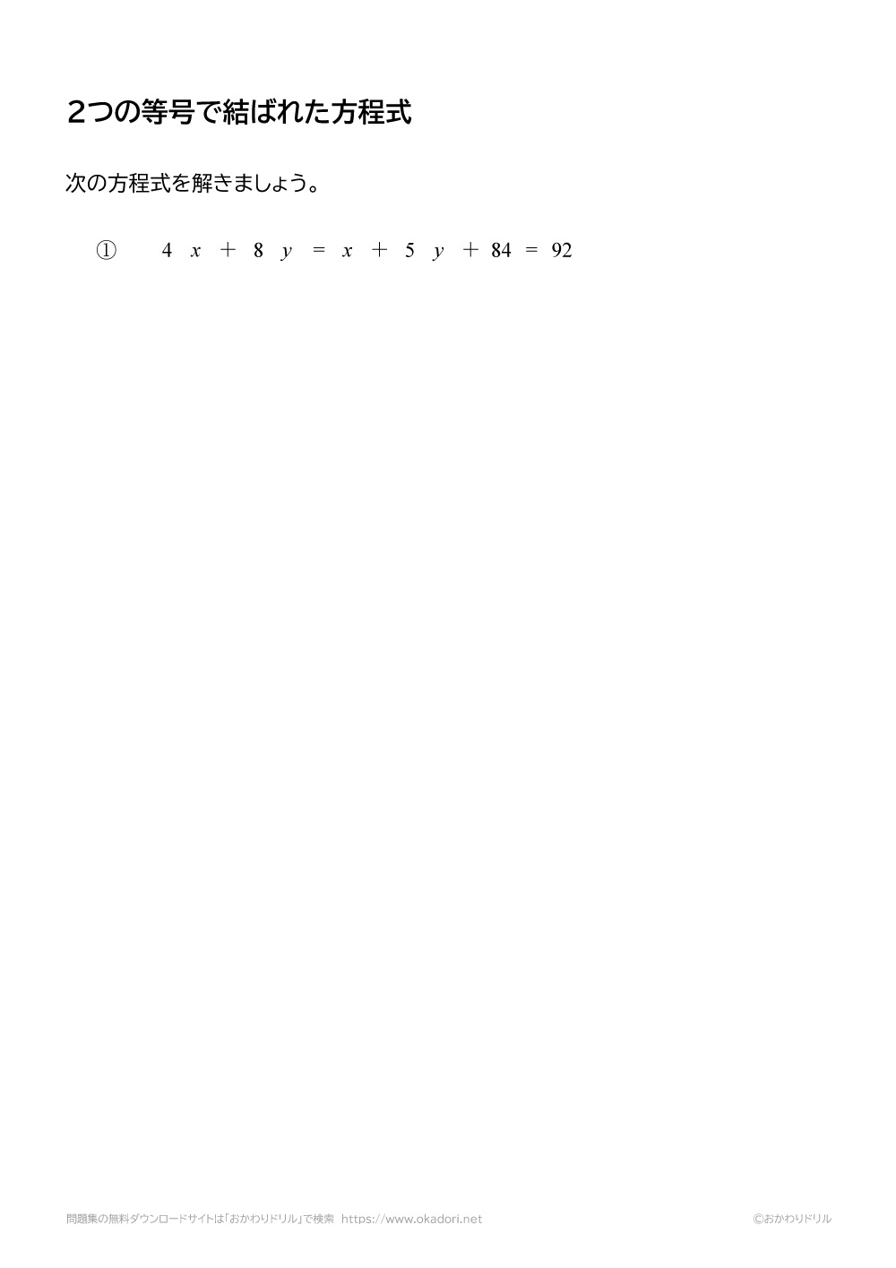 2つの等号で結ばれた方程式を解く問題です。連立方程式をつくってから解きましょう。
