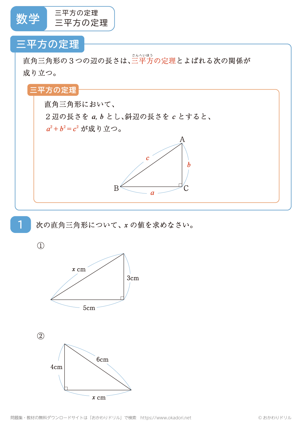 ・直角三角形の2辺の長さをa、bとし、斜辺の長さをcとすると、3辺の長さの関係はa2+b2=c2となります。